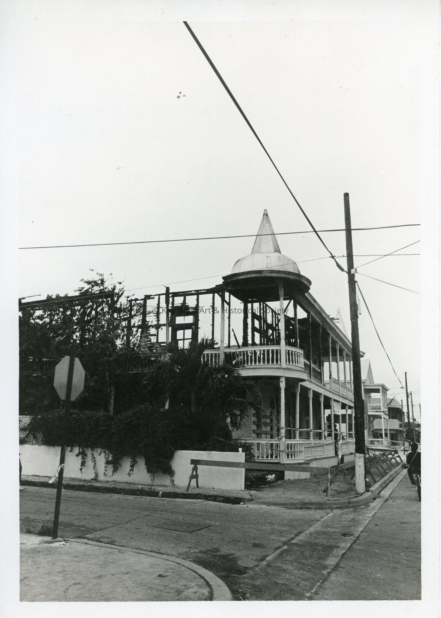 Black and white photograph of the Fountains restaurant, located corner of Duval and Amelia Streets, after a fire caused by a gas leak in 1983.