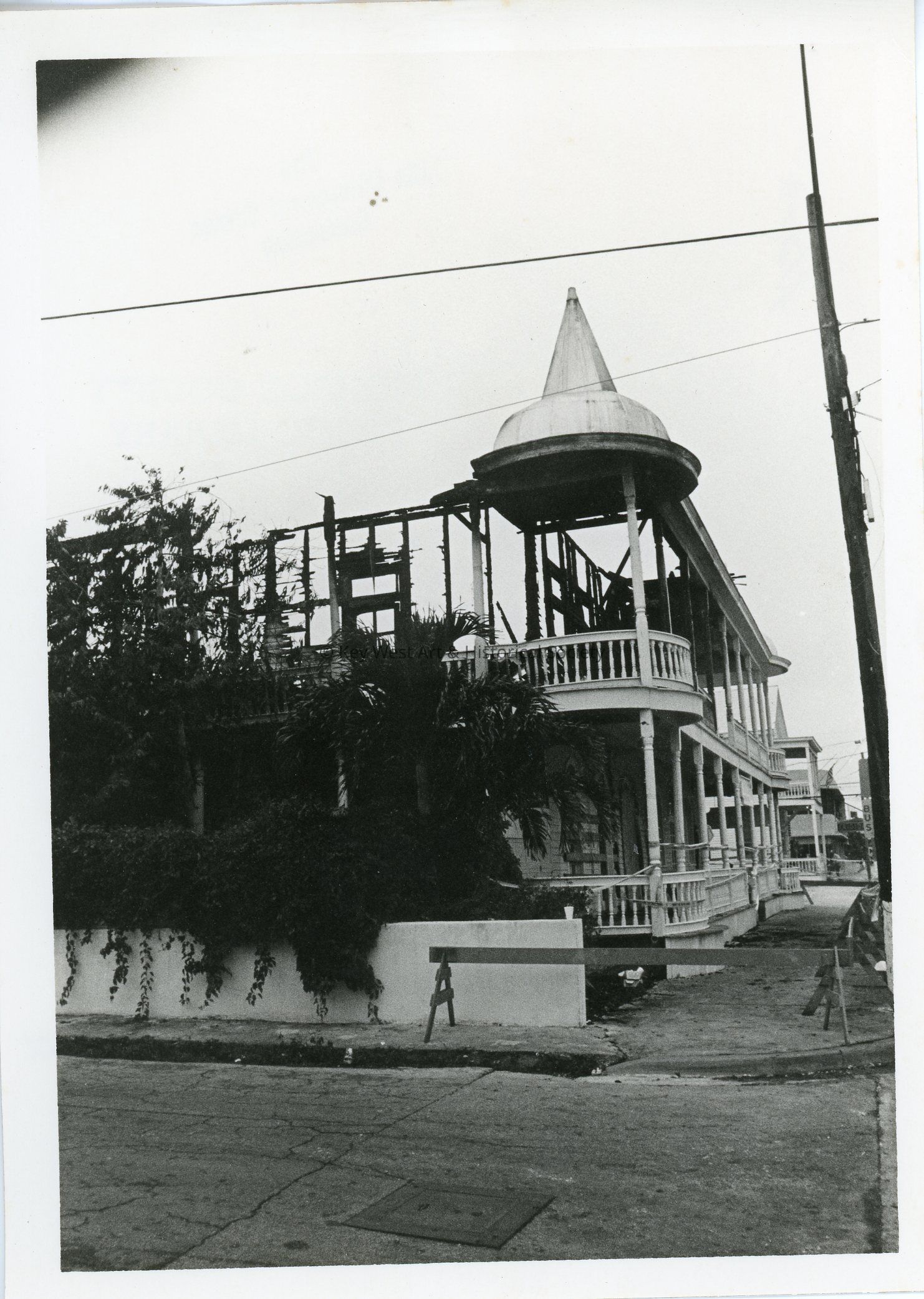 Black and white photograph of the Fountains restaurant, located corner of Duval and Amelia Streets, after a fire caused by a gas leak in 1983.