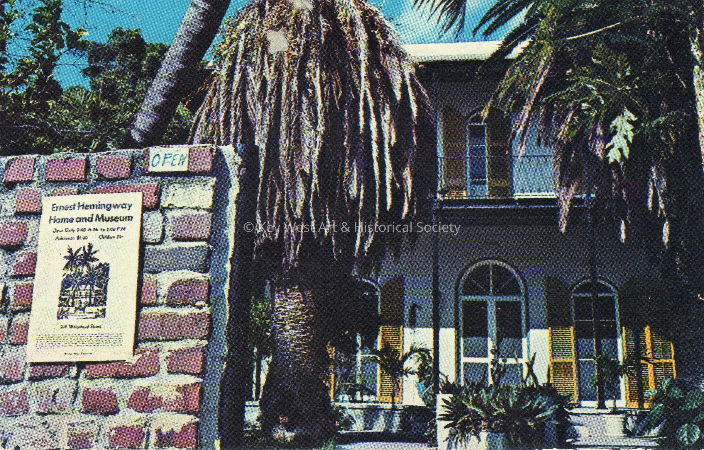 Postcard depicting the entrance to the Ernest Hemingway Home and Museum. Caption on verso reads, ‘The Hemingway House – the great Ernest Hemingway lived in this house through the writing years of his famous novels. This picturesque home is open to the public.’Subject Place