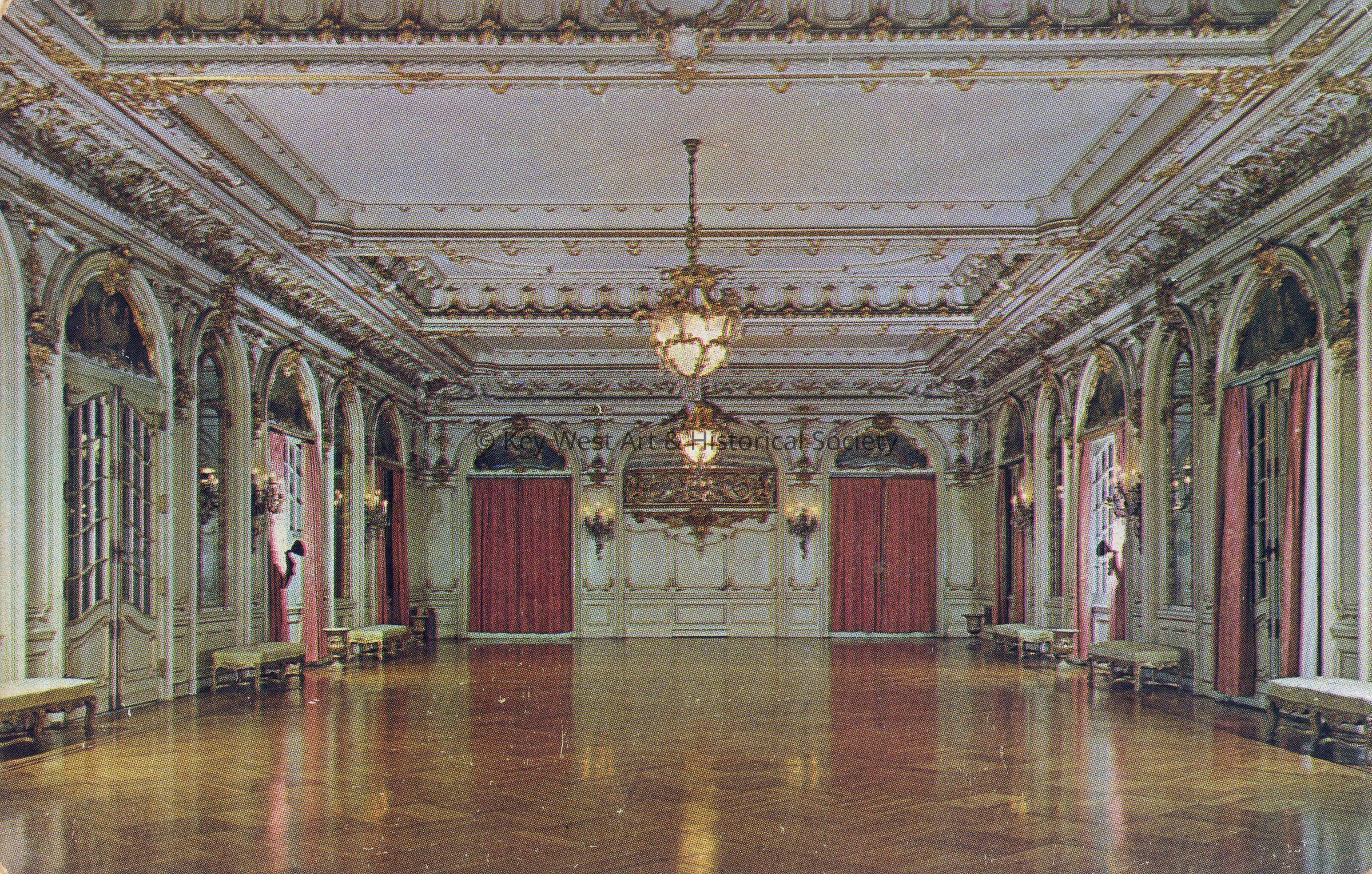 Postcard of the Henry Flagler Museum ballroom. Notation on verso, 'The Henry Morrison Flagler Museum, Whitehall Way, Palm Beach, Florida. Ballroom: This tremendous room, 91 by 37 feet, is decorated in the style of Louis XV. Its color scheme is soft toned white and gold, Boucher panels installed above the long windows provide an aura of refined fastidious elegance of the old world, the beautiful ornamented mirrors between the windows, the jeweled chandeliers are typical of the famous ballrooms of the 15th Century.'Subject Person/Organization