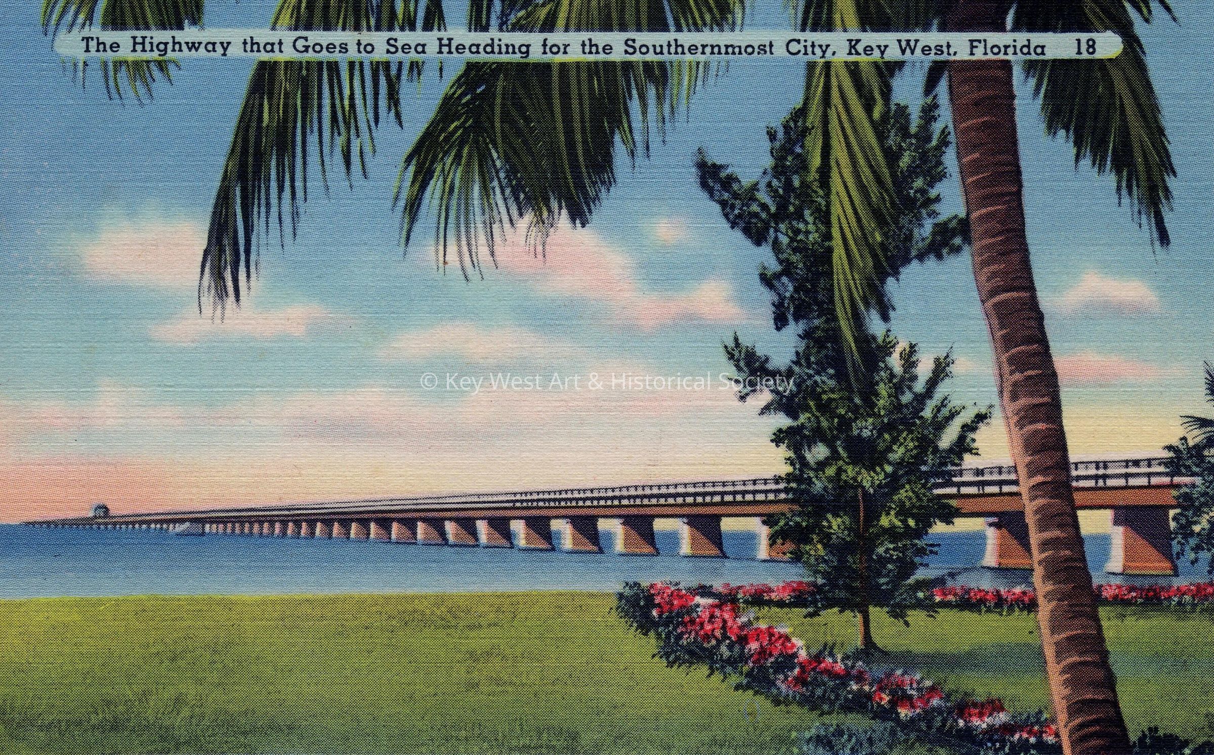 Postcard depicting a long bridge. The caption reads, ‘ The highway that goes to sea heading for the southernmost city, Key West, Florida’. The description on the verso reads, 'The new Overseas Highway constructed on the former roadbed of the Overseas Railway, abandoned after its partial destruction in 1935, links the mainland to Key West, the Southernmost City in the United States.'Subject Place