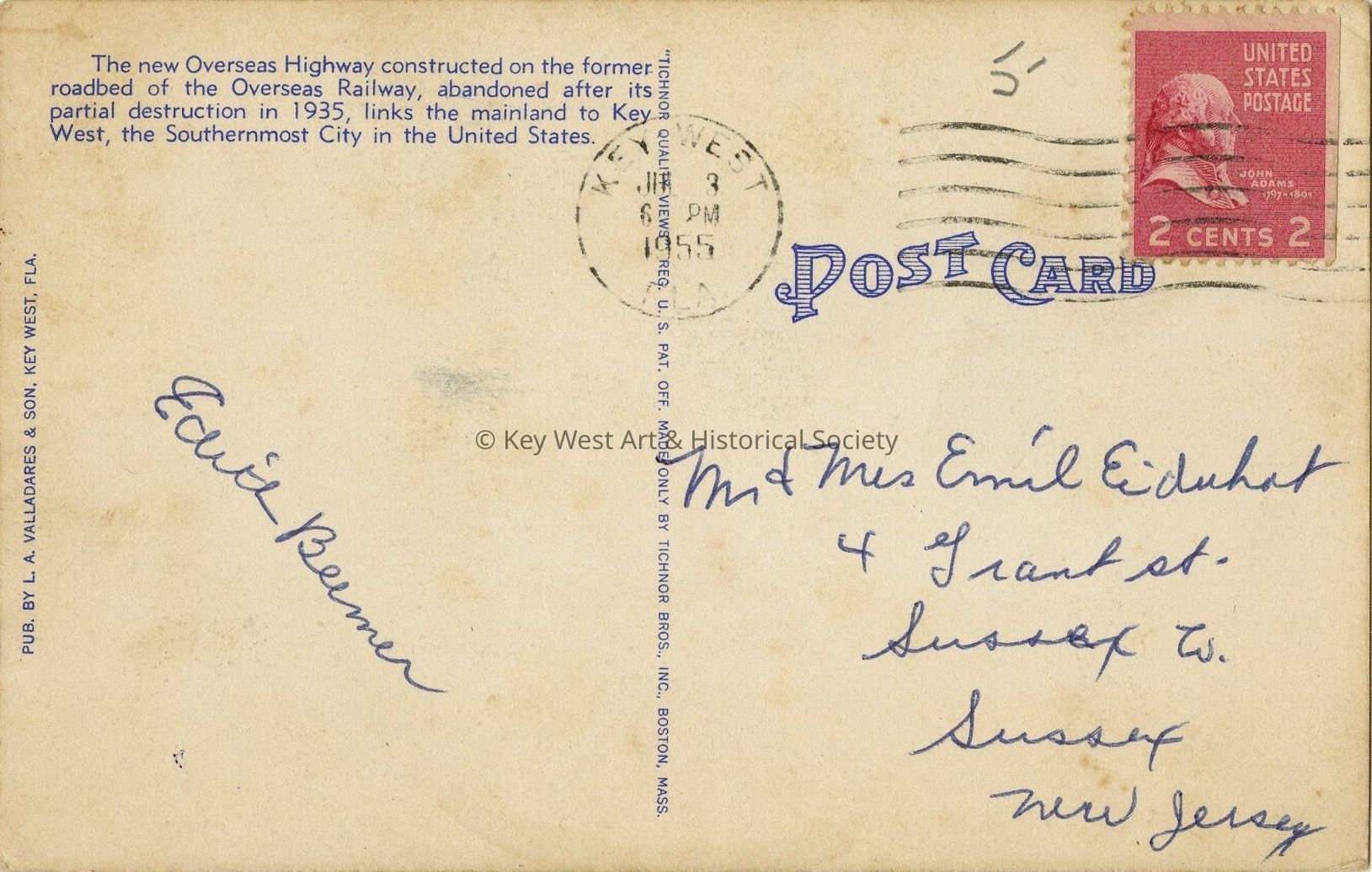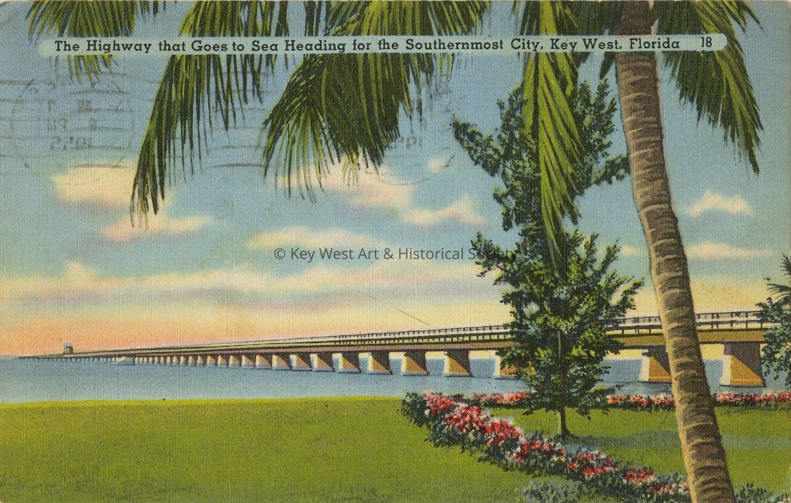 Postcard depicting the highway that goes to sea heading for the Southernmost City, Key West, Florida. The new Overseas Highway constructed on the former roadbed of the Overseas Railway, abandoned after its partial destruction in 1935, links the mainland to Key West, the Southernmost City in the United States.Collection