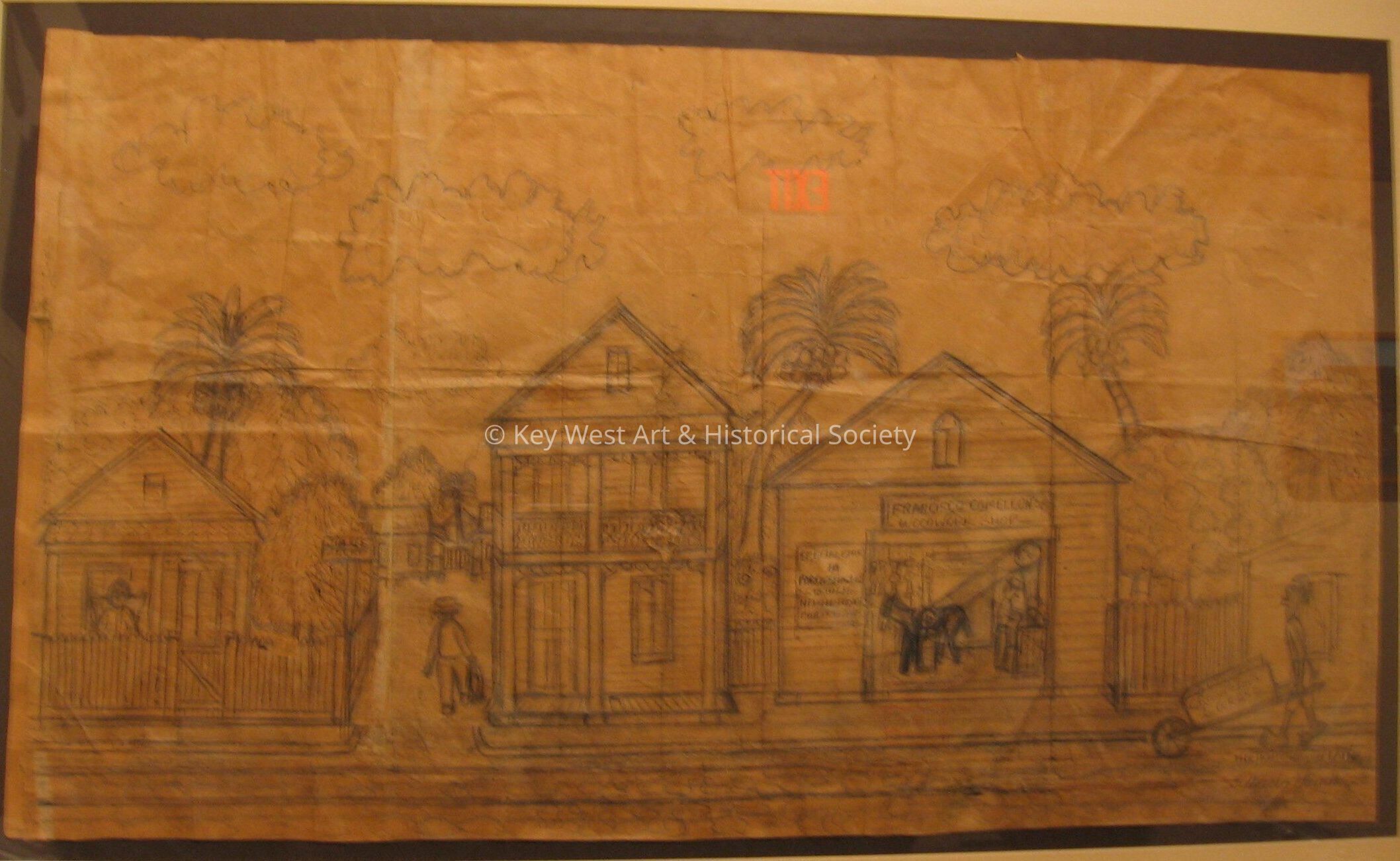 Paper bag drawing by Mario Sanchez featuring Jim Kee attorney, Francisco Canlon wood work and horse.Type of Drawing