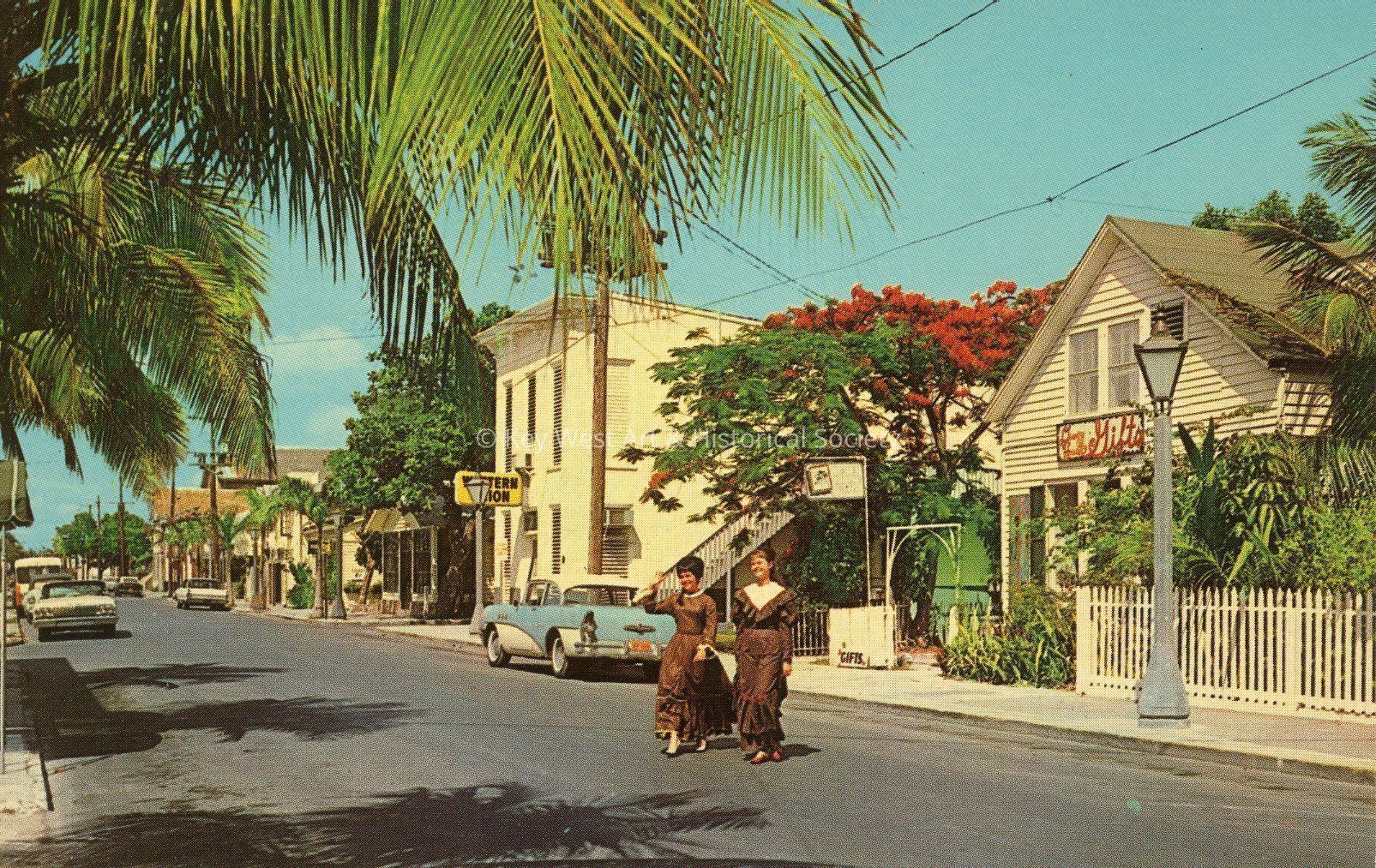 Postcard depicting the John Dewey house on Greene Street in Key West, Florida. "Adjacent to the Audubon House is the recently restored cottage where the late John Dewey, well known educator of Columbia University, spent many of his declining years. Note the old Key West dormer windows and patio. Next to the cottage is the Telegraph building where Richard Harding Davis sent his wires during the Spanish American War. A beautiful flame tree is between the buildings and further down the street are other restored Greene Street buildings and Sloppy Joe's, where Ernest Hemingway often visited with his fishing friends."Collection
