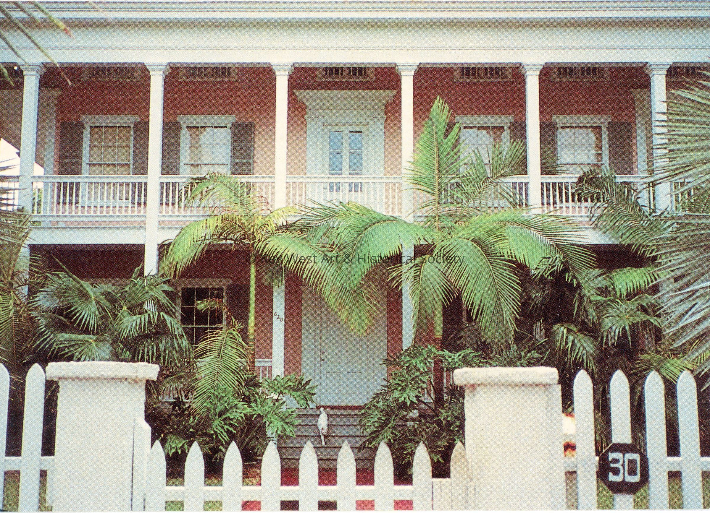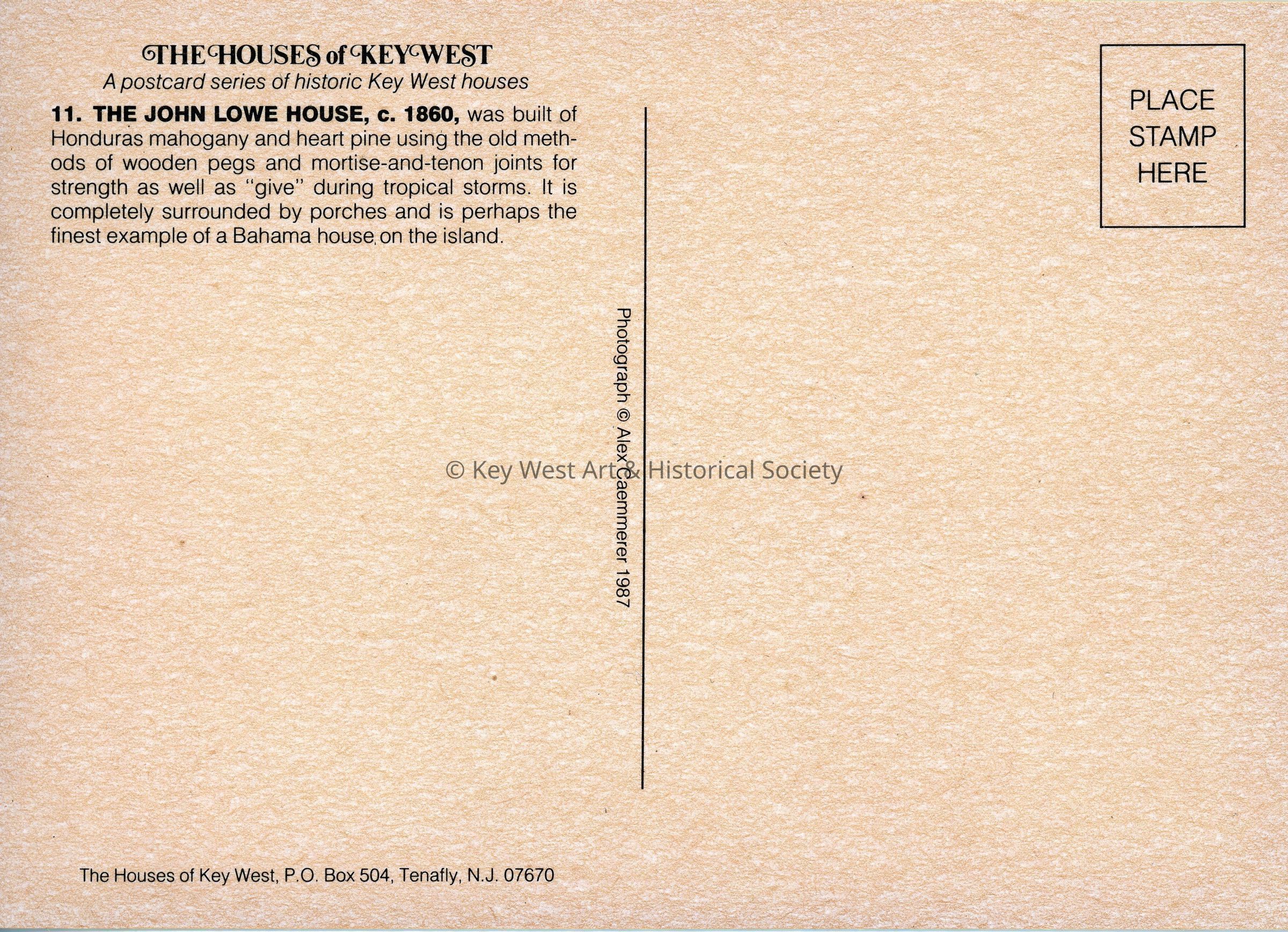 Postcard belonging to 'The Houses of Key West' series depicting the John Lowe House located at 620 Southard Street. Notation on verso reads '11. THE JOHN LOWE HOUSE, c. 1860, was built of Honduras mahogany and heart pine using the old methods of wooden pegs and mortise-and-tenon joints for strength as well as "give" during tropical storms. It is completely surrounded by porches and is perhaps the finest example of a Bahama house on the island.'Subject Place
