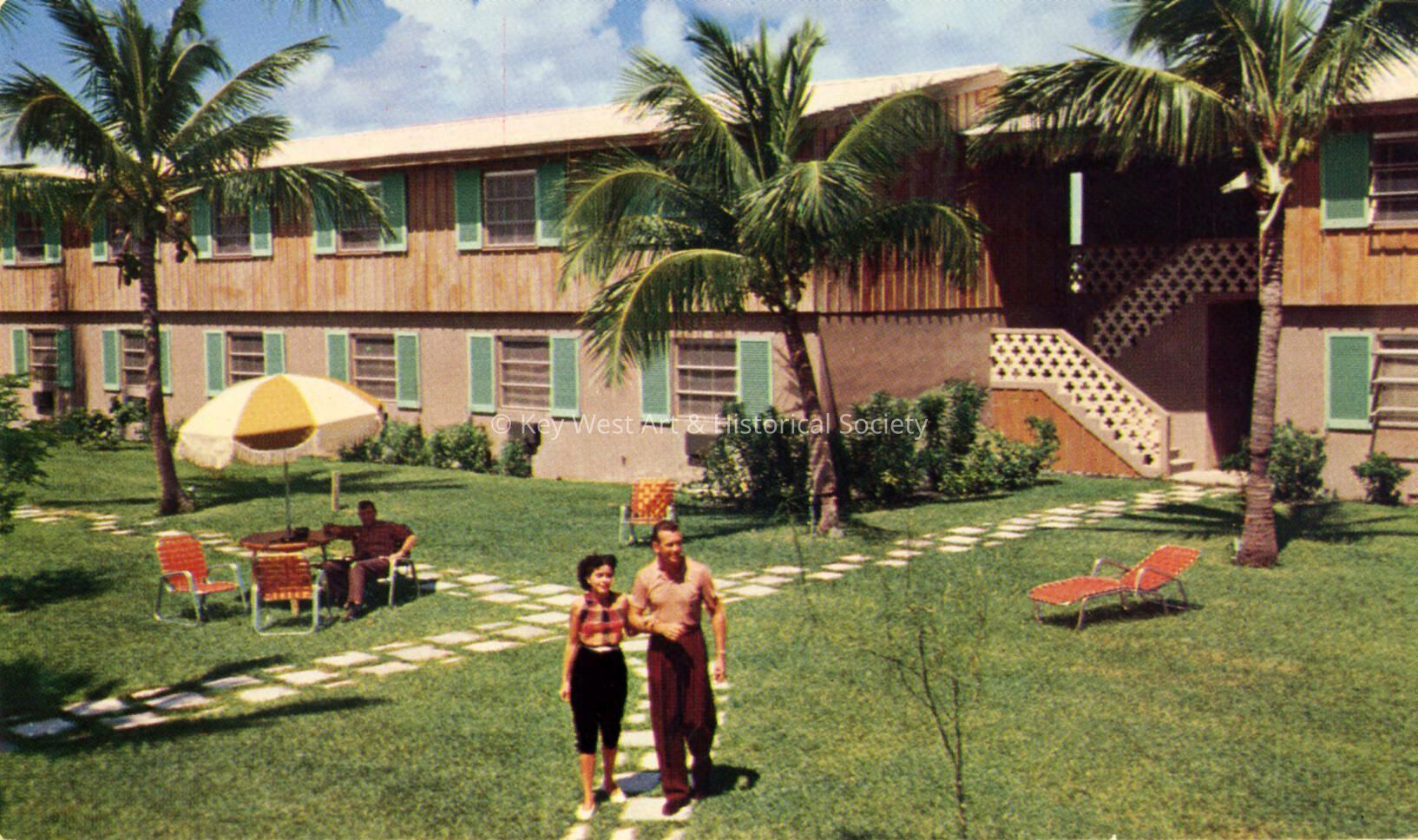 Postcard depicting a couple on the grounds of the Key Wester Hotel on South Roosevelt Boulevard. Notation on verso reads, 'The Key Wester on the ocean at Key West. Hotel, cottage colony, cabana club; 116 rooms with private bath; pool; shuffleboard; excellent fishing. Coffee shop.' In the possession of Mr. and Mrs. Dick Steigerwald (Richard and Joan) who spent their honeymoon in Key West from January 29 to February 8, 1956.Collection