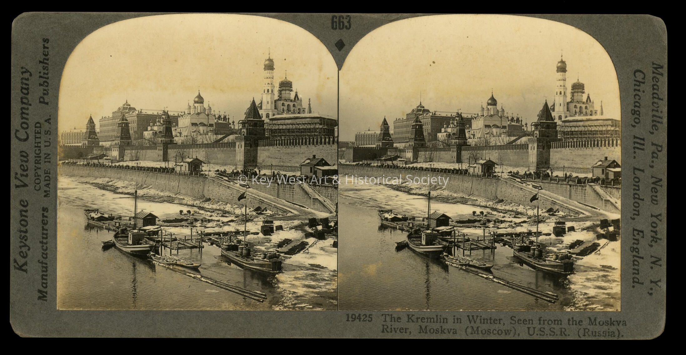 Black and white stereoview of the Kremlin in winter, seen from the Moskva River, Moscow, Russia. Extensive description printed on verso.Collection
