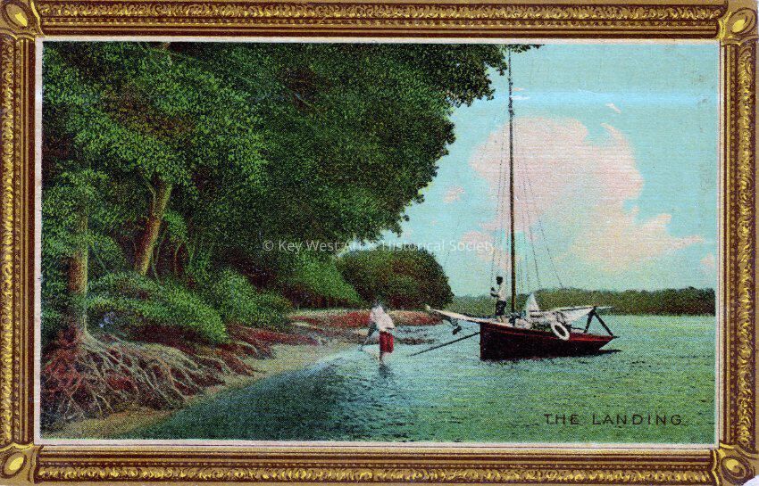 Postcard depicting a framed painting of a sailboat near the bank of a river. The caption reads, ‘The Landing’.