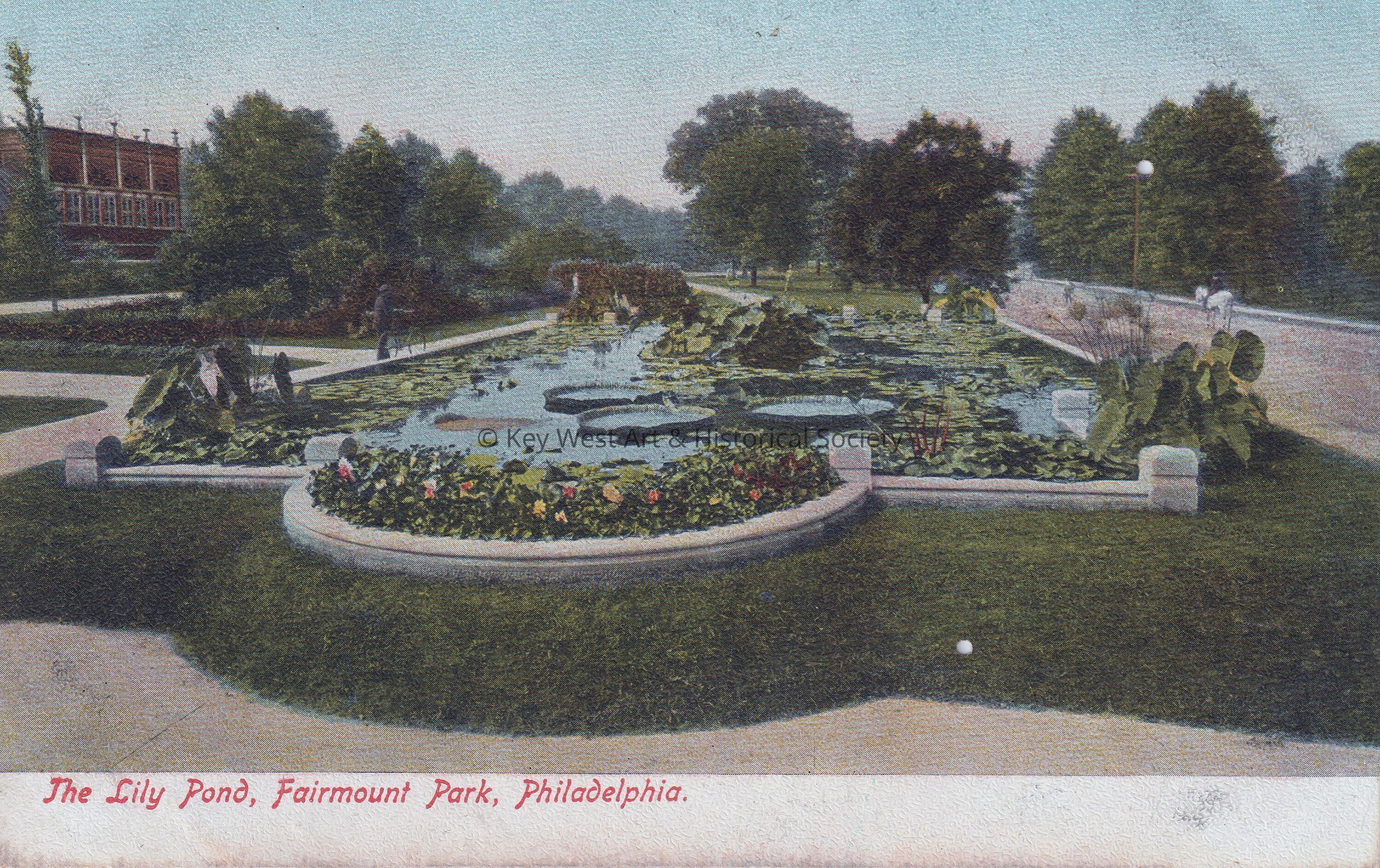 Postcard depicting a lily pond in a park. The caption reads, ‘The Lily Pond, Fairmount Park, Philadelphia.’Collection