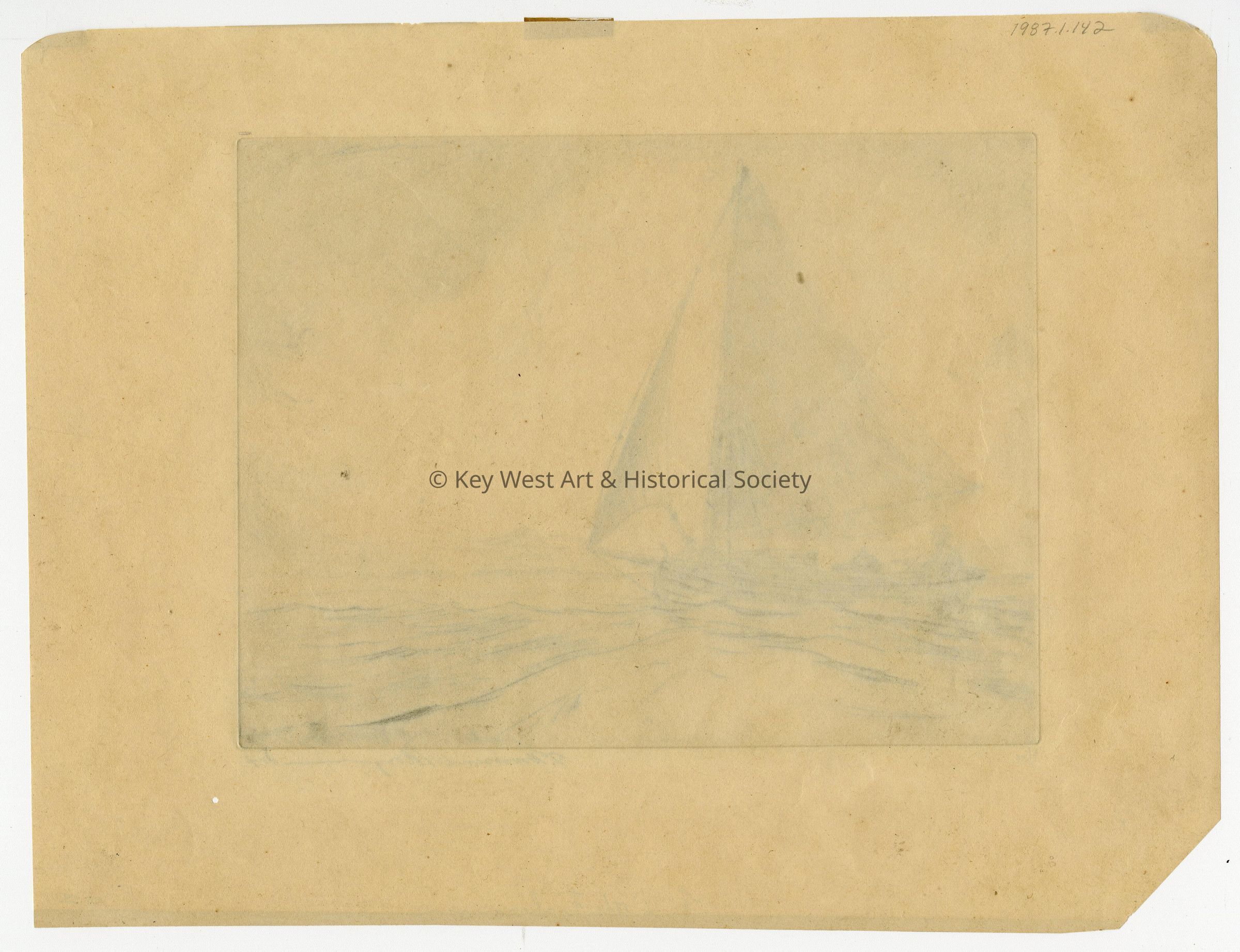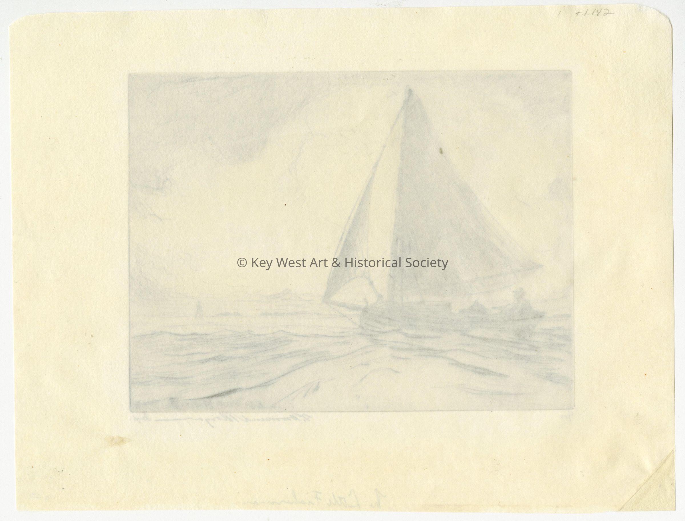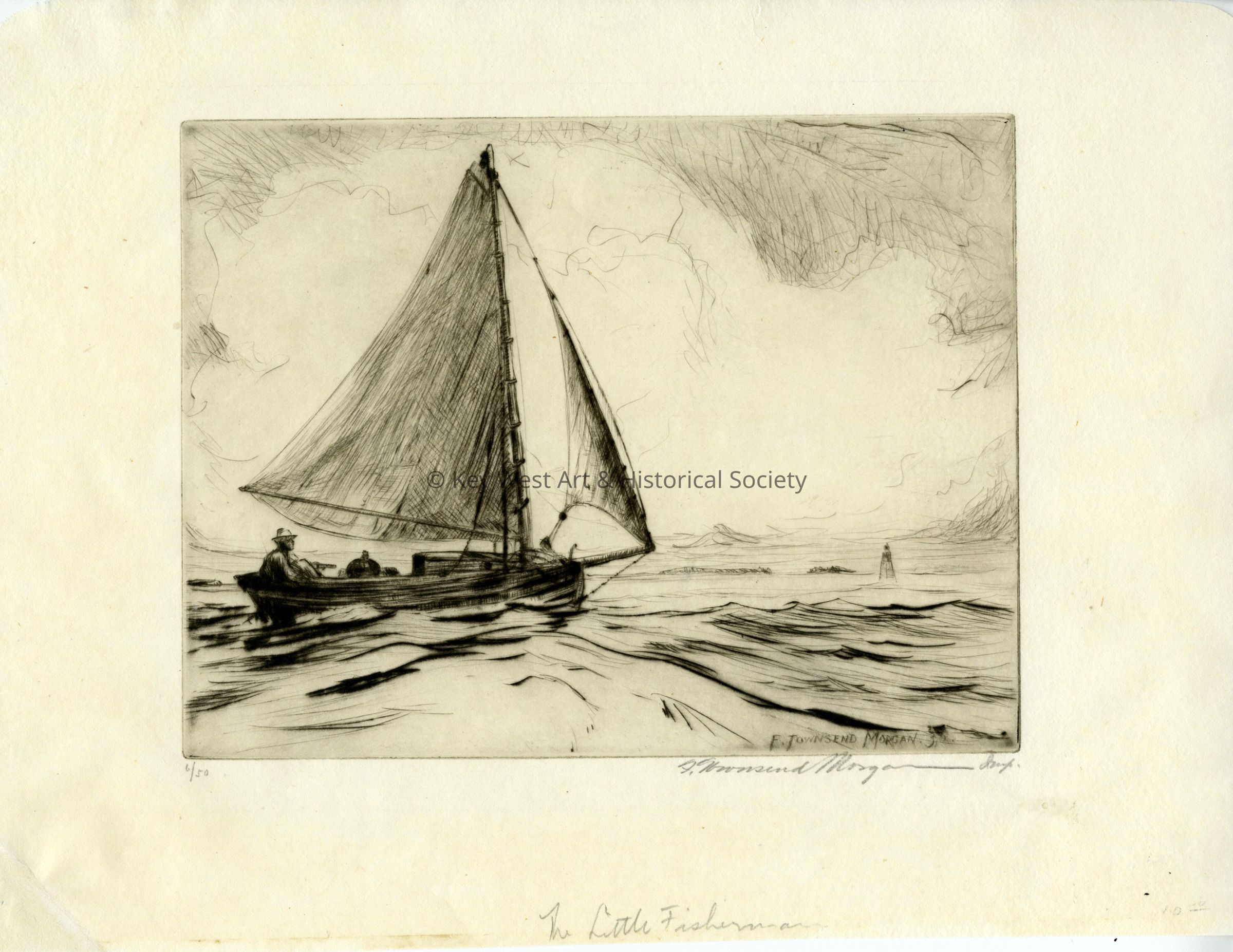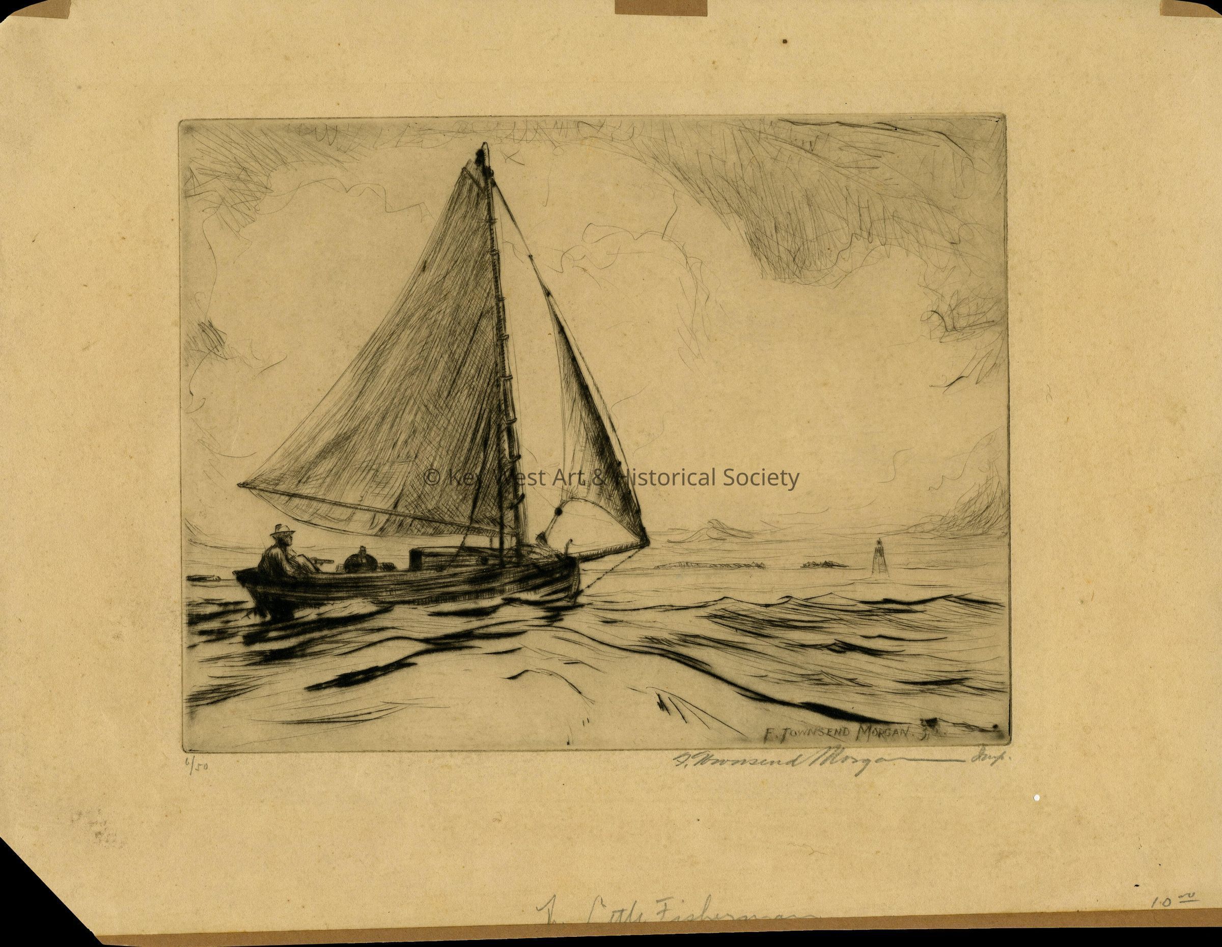 Etching by F. Townsend Morgan depicting a man in a small sailboat. Sand Key Lighthouse seen in the background. Numbered 6/50.
