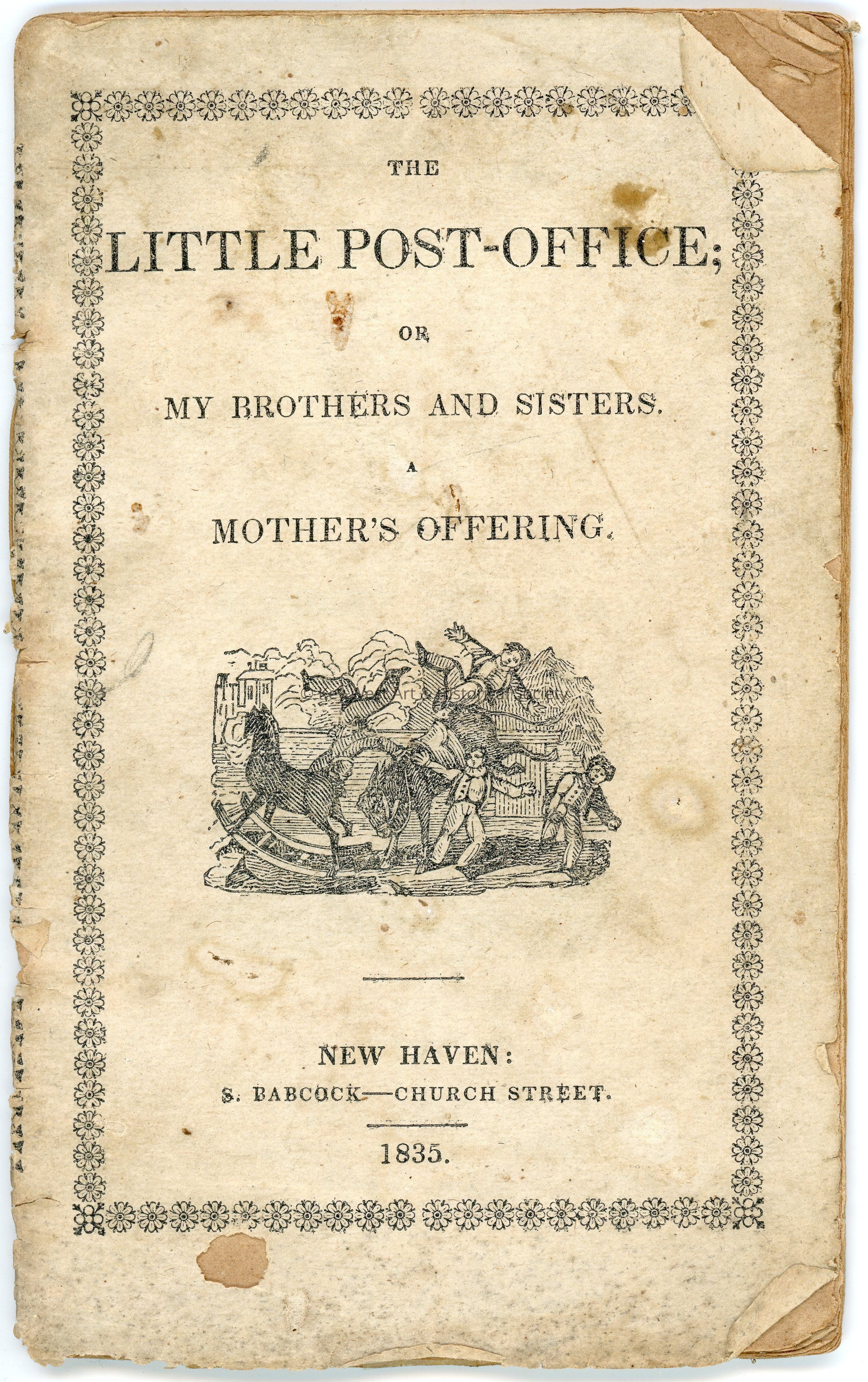 White paperback booklet with black text. The front cover has a small woodcut print of four figures, two of which are being flung into the air by a horse. The booklet contains the story of the author, one of seven children, and how they and their siblings would write letters to each other and mail them at the post office, a drawer in their home.Collection
