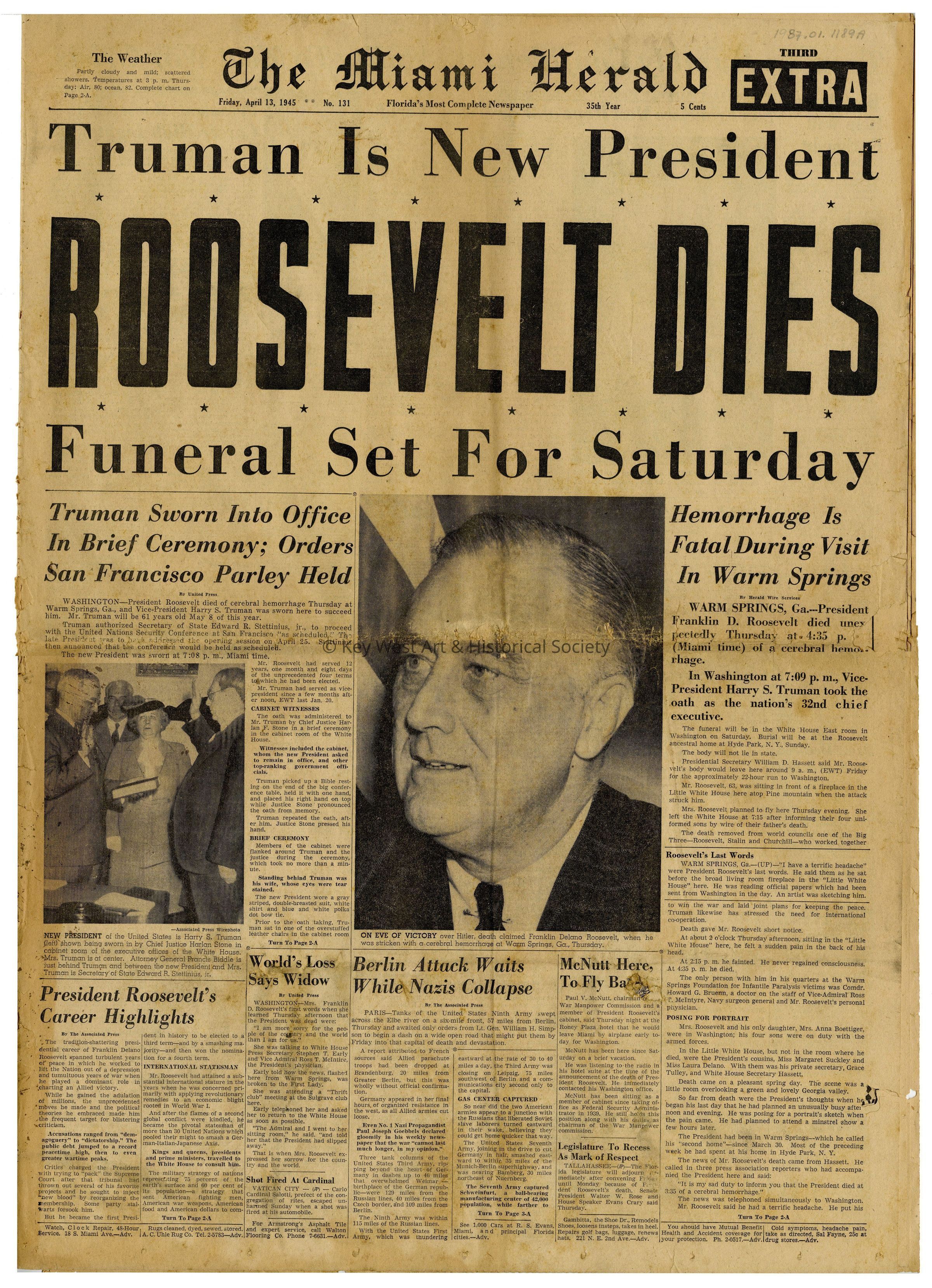 Edition of The Miami Herald from April 13, 1945, detailing the death of US President Franklin Delano Roosevelt and the swearing in of Harry S Truman as his successor.