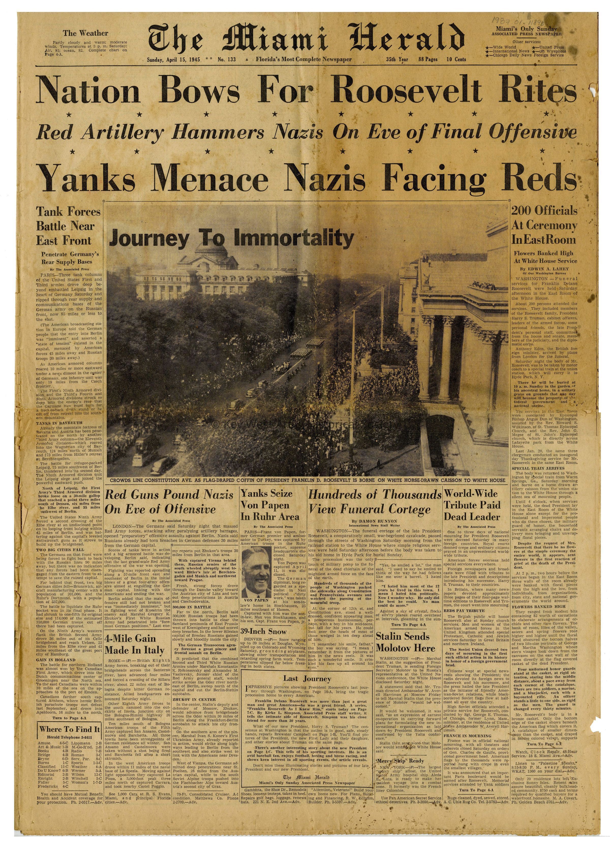 Edition of The Miami Herald from April 15, 1945, detailing the funeral arrangements for US President Franklin Delano Roosevelt.
