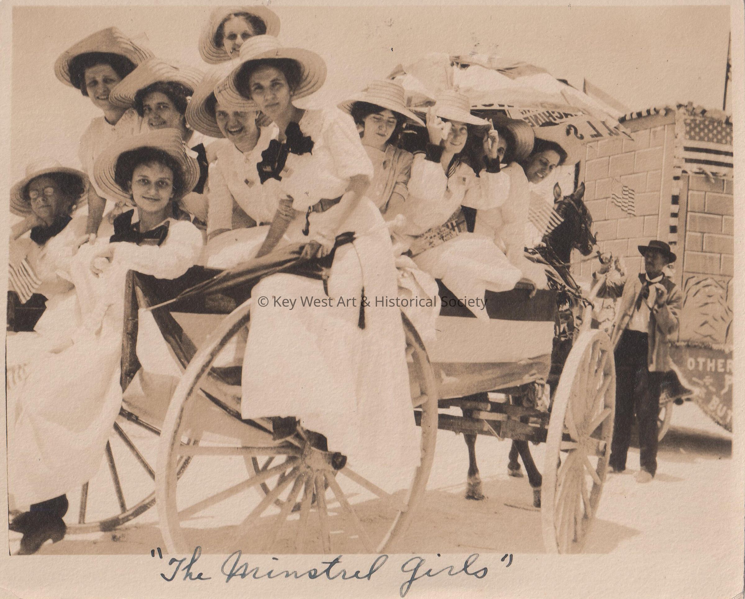 Black and white photo of a group of women sitting in a carriage for a 4th of July celebration or parade. Handwritten caption reads, 'The Minstrel Girls'.Photograph Details