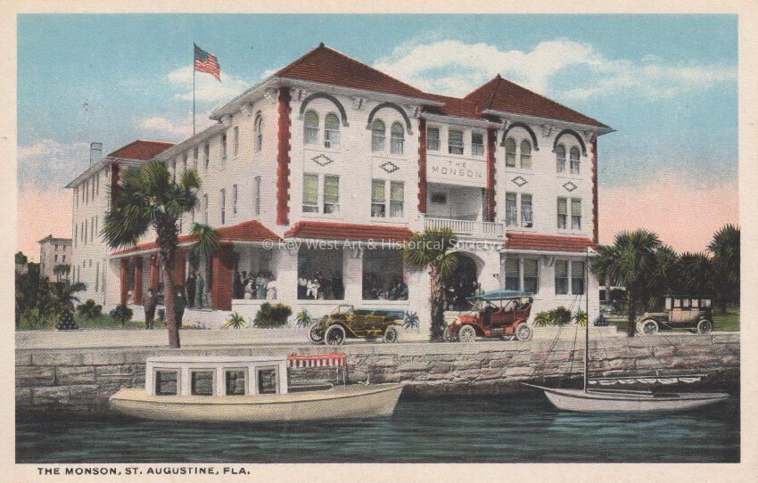 Postcard of boats and cars in front of the Monson House. The caption reads, ’The Monson, St. Augustine, Florida.’ The description on the verso reads, ‘The Monson House, New Modern Fireproof, opened January 1915, All Rooms have running hot and cold water, steam heat, electric lights, and an unobstructed view of Bay and Ocean, house fly-screened throughout.’Collection