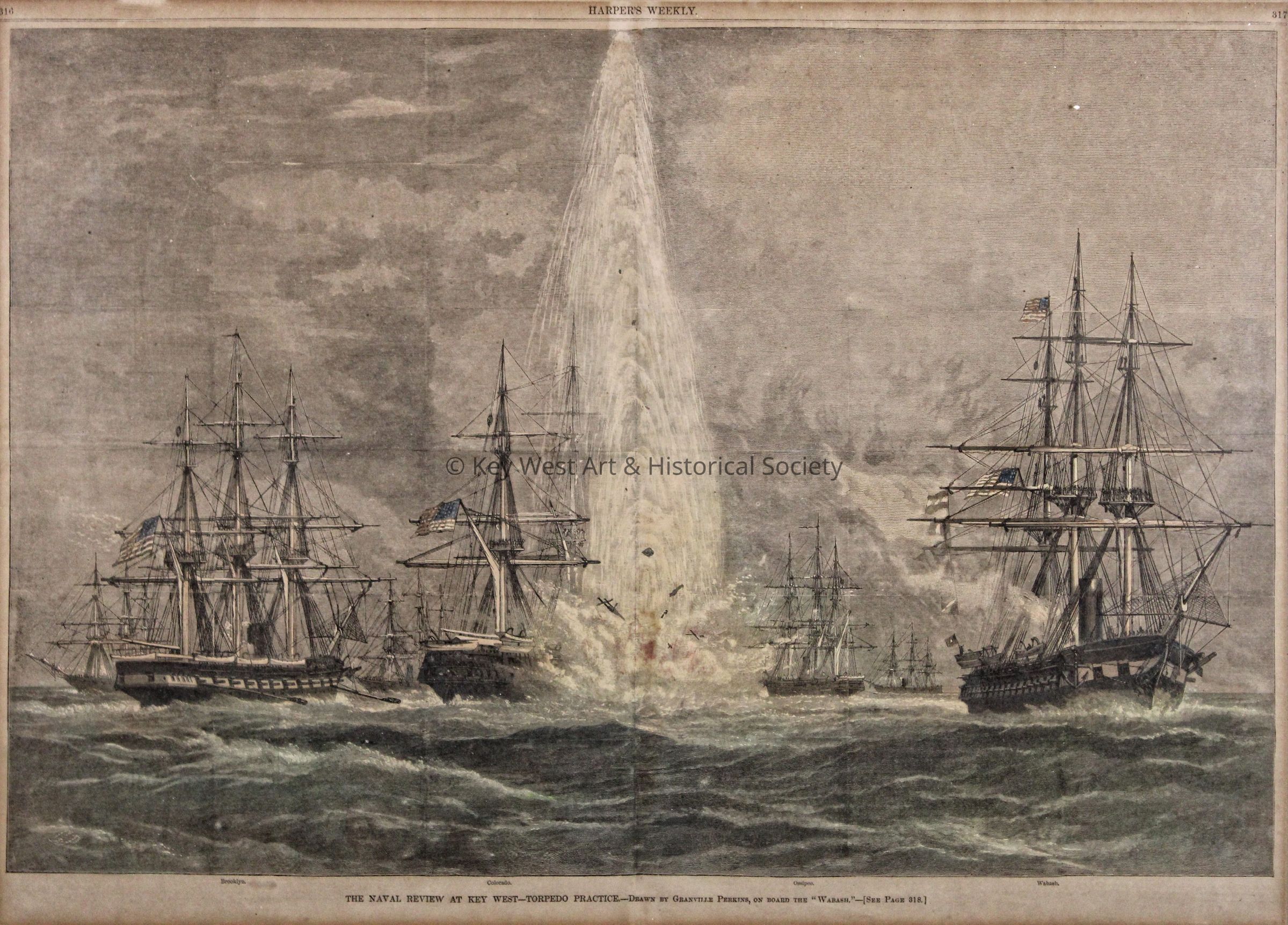 Woodblock print with hand tinting from the April 11, 1874 edition of Harper's Weekly featuring the US Naval Review at Key West during torpedo practice. Ships depicted are the USS BROOKLYN, USS COLORADO, USS OSALPEE and USS WABASH.Collection