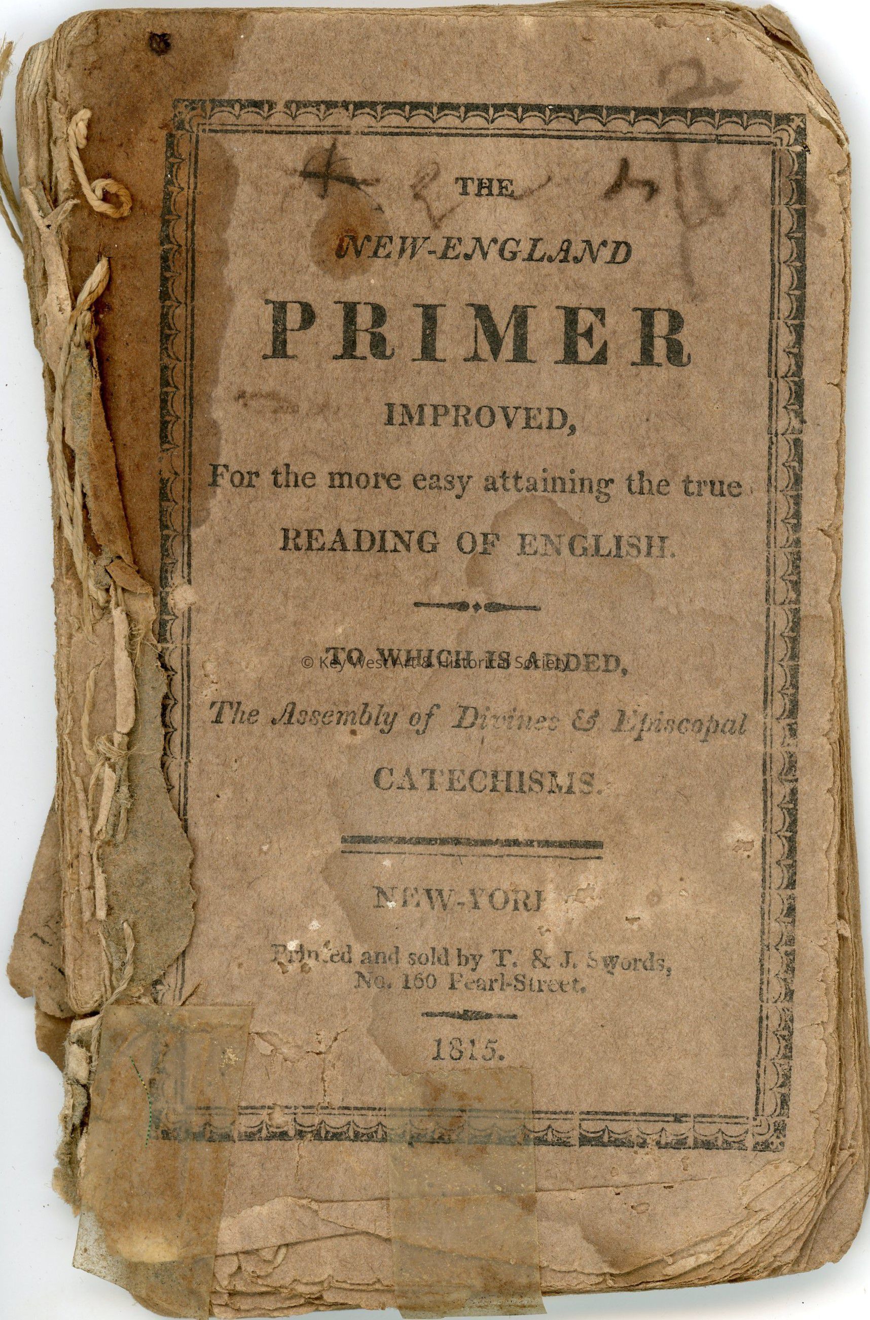 A small paper bound book with black text with lessons on learning how to read the English language. Lessons include learning the alphabet with mnemonics, easy beginner words, and catechisms.Collection