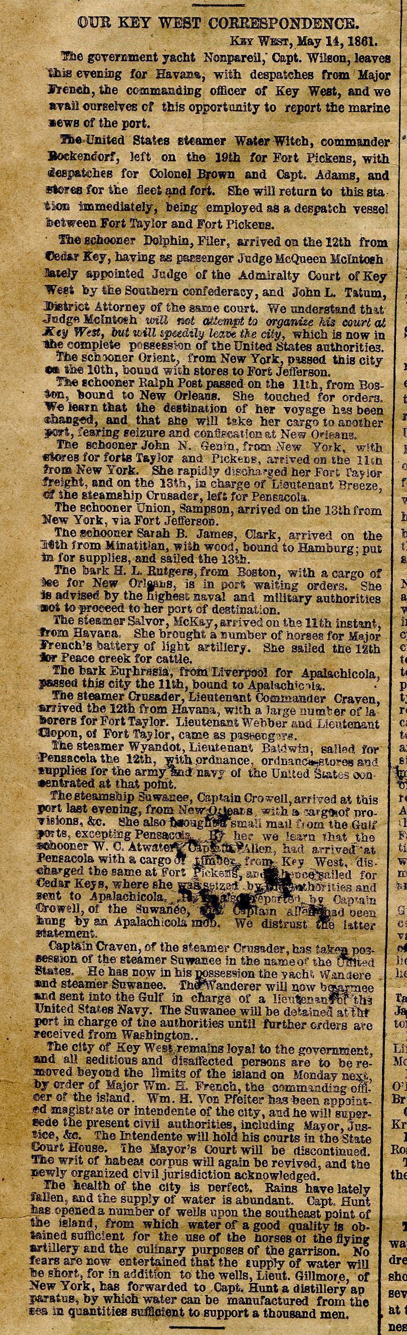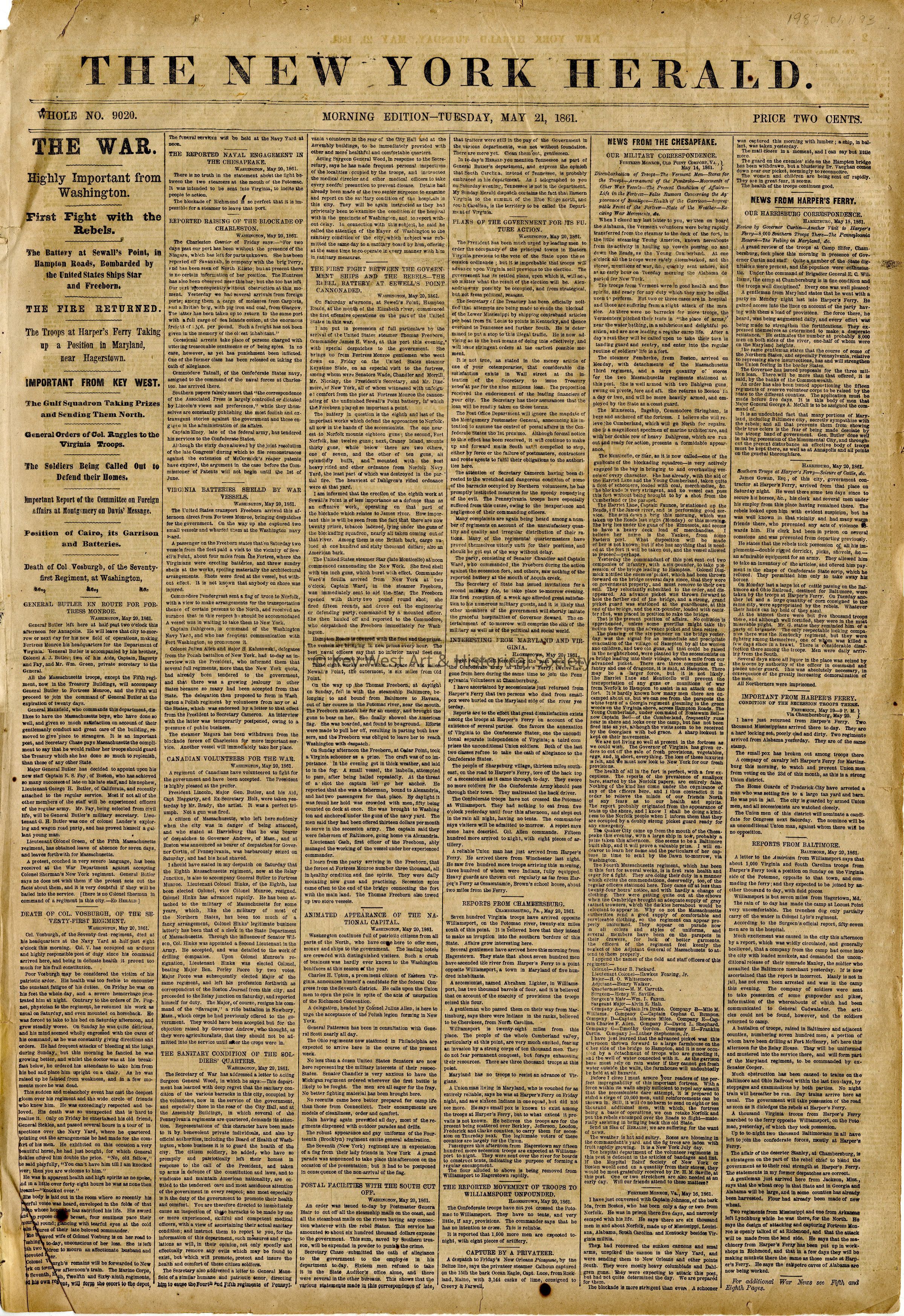 Edition of The New York Herald from May 21, 1861, describing Key West and its preparations for the Civil War on page 8. Notes on the arrival of ships and Captain Hunt's garrison preparations.Collection