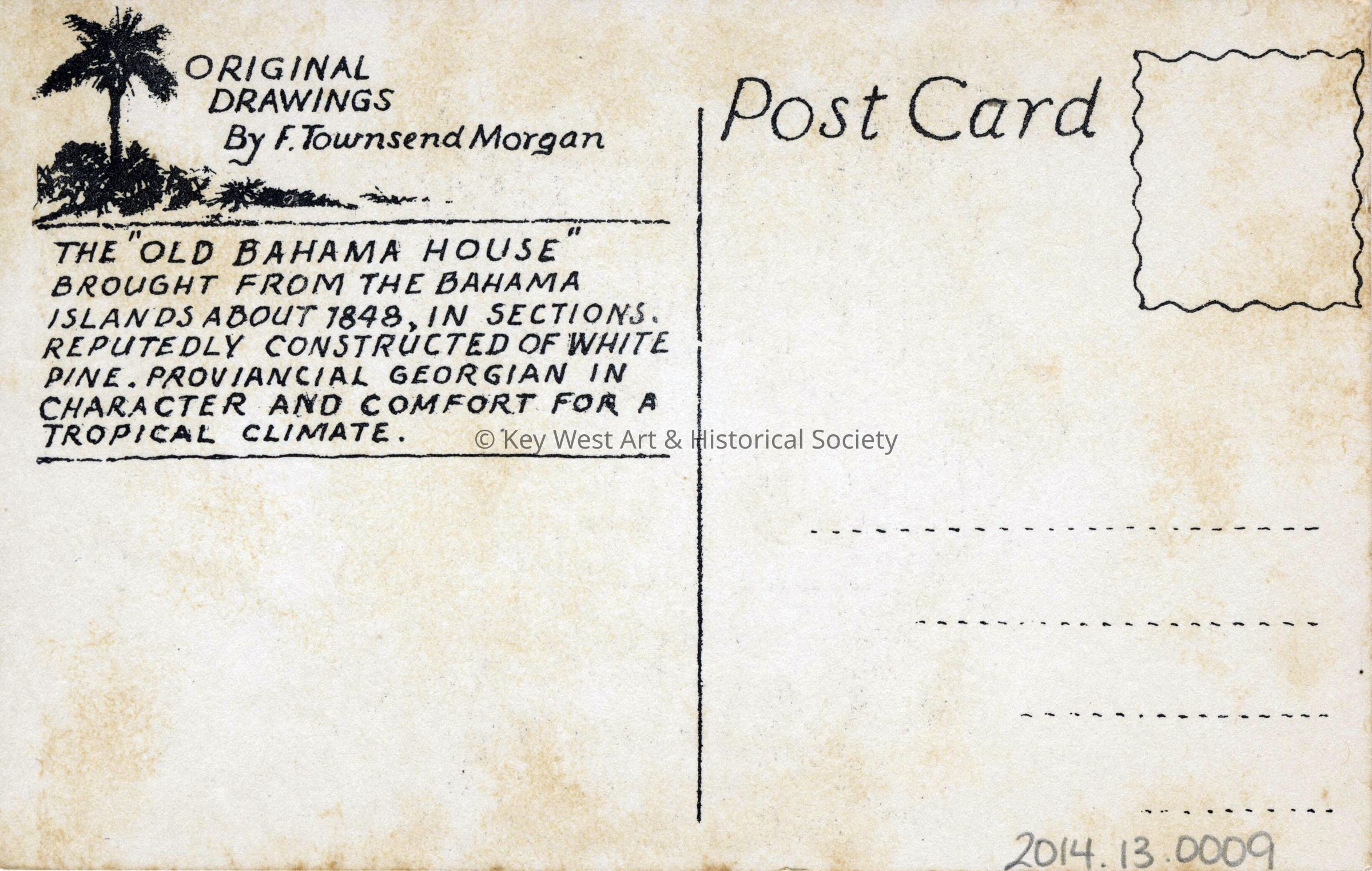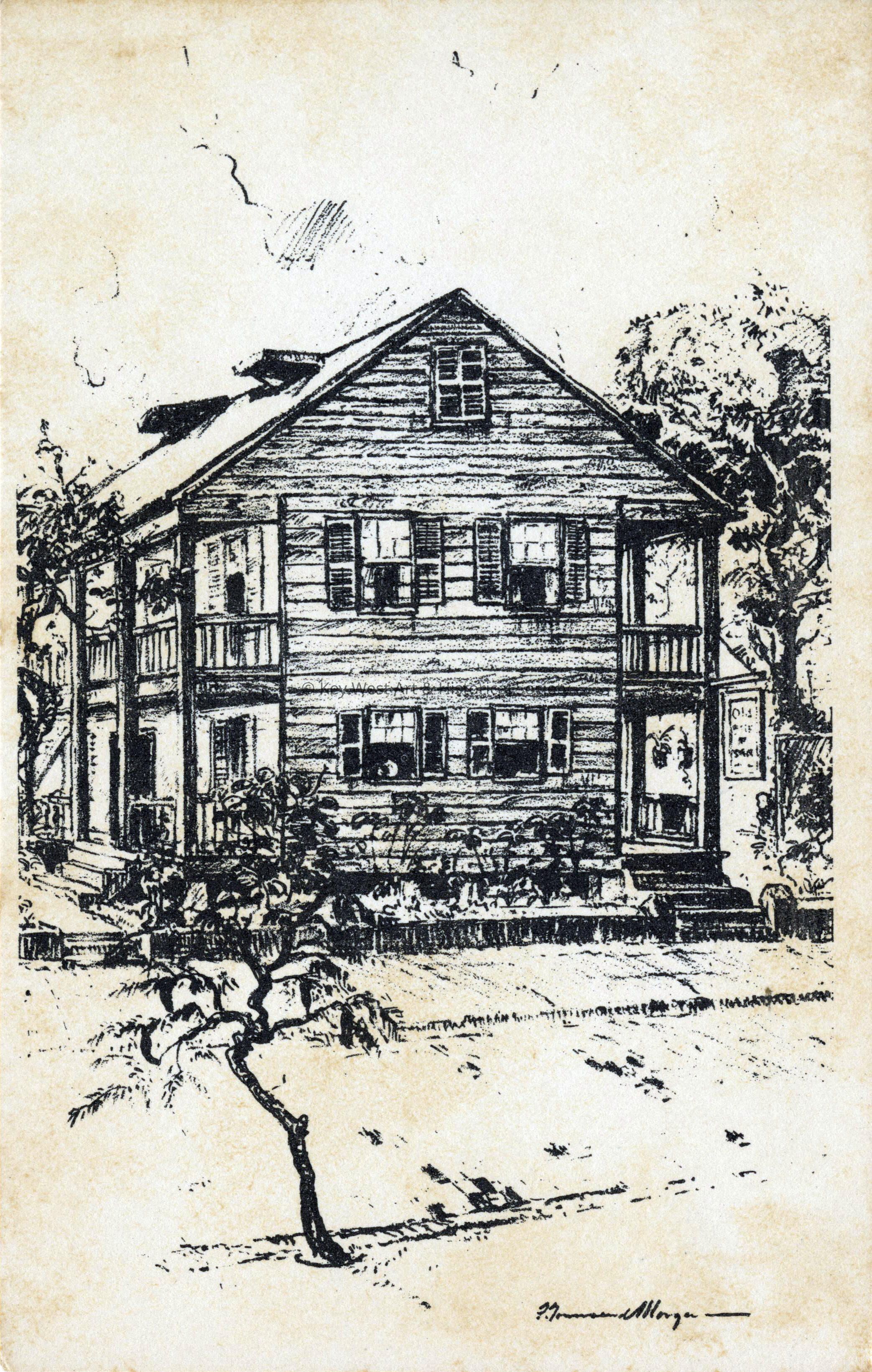 Postcard depicting the old Bahama House in Key West taken from a lithograph by Franklin Townsend Morgan. Printed on verso, 'The Old Bahama House brought from the Bahama Islands about 1848, in sections. Reputedly constructed of white pine. Proviancial [sic] Georgian in character and comfort for a tropical climate.'Subject Place
