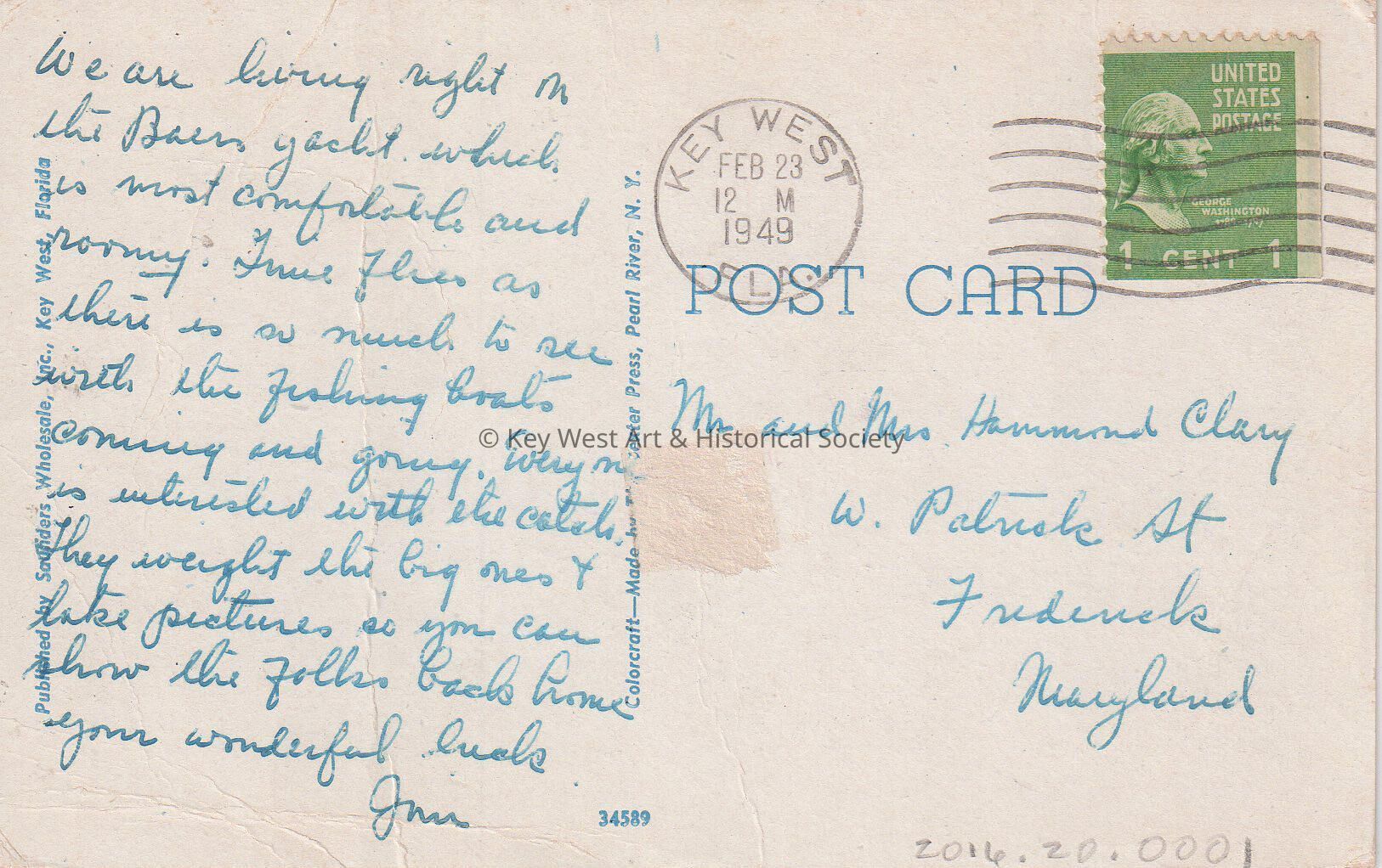 Postcard of the two-story Caroline Lowe home with a widow’s walk that formerly stood on the corner of Duval and Caroline streets. The caption reads, ‘The Old Caroline Lowe Home, Key West, Florida.’Subject Place