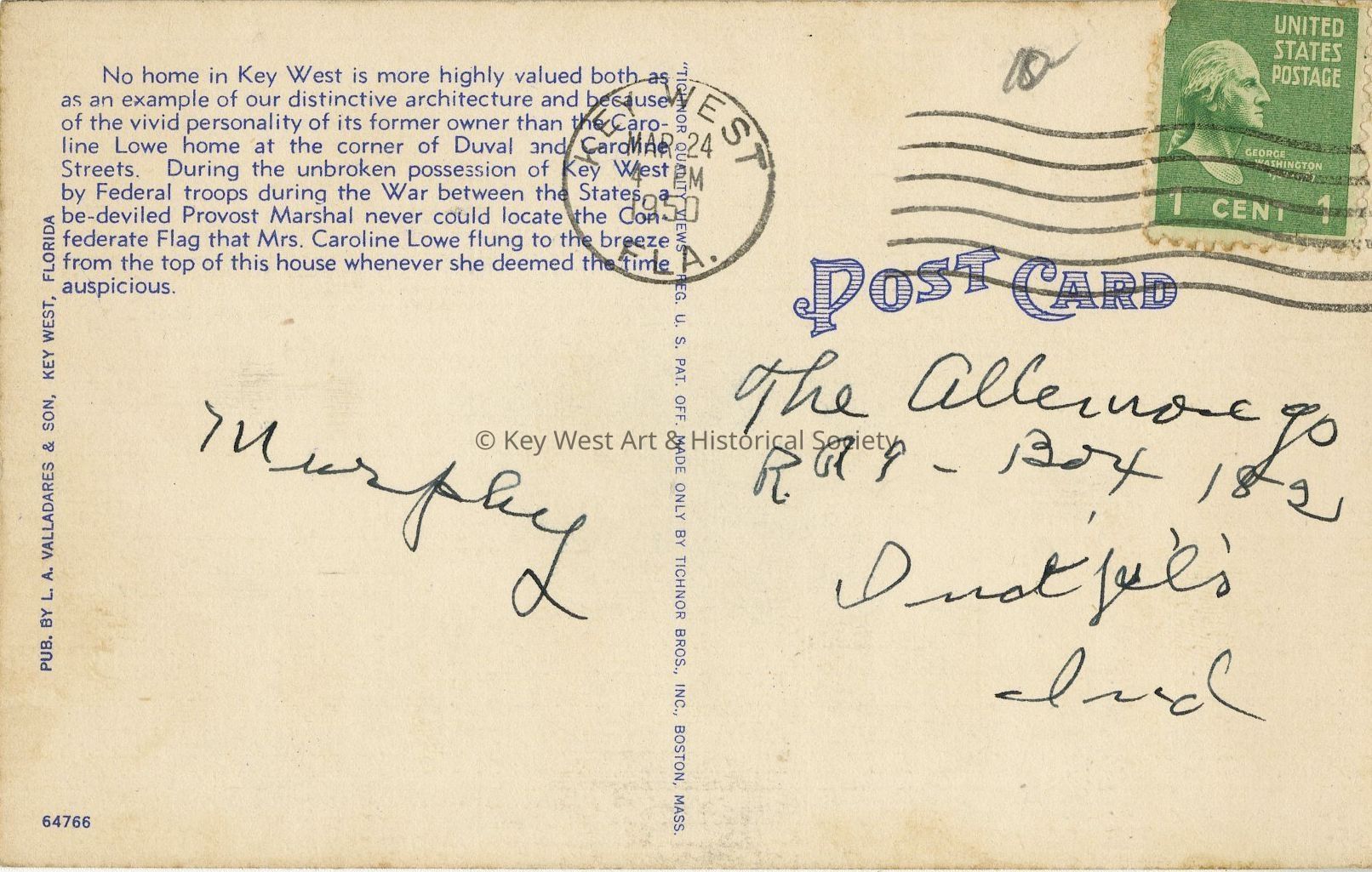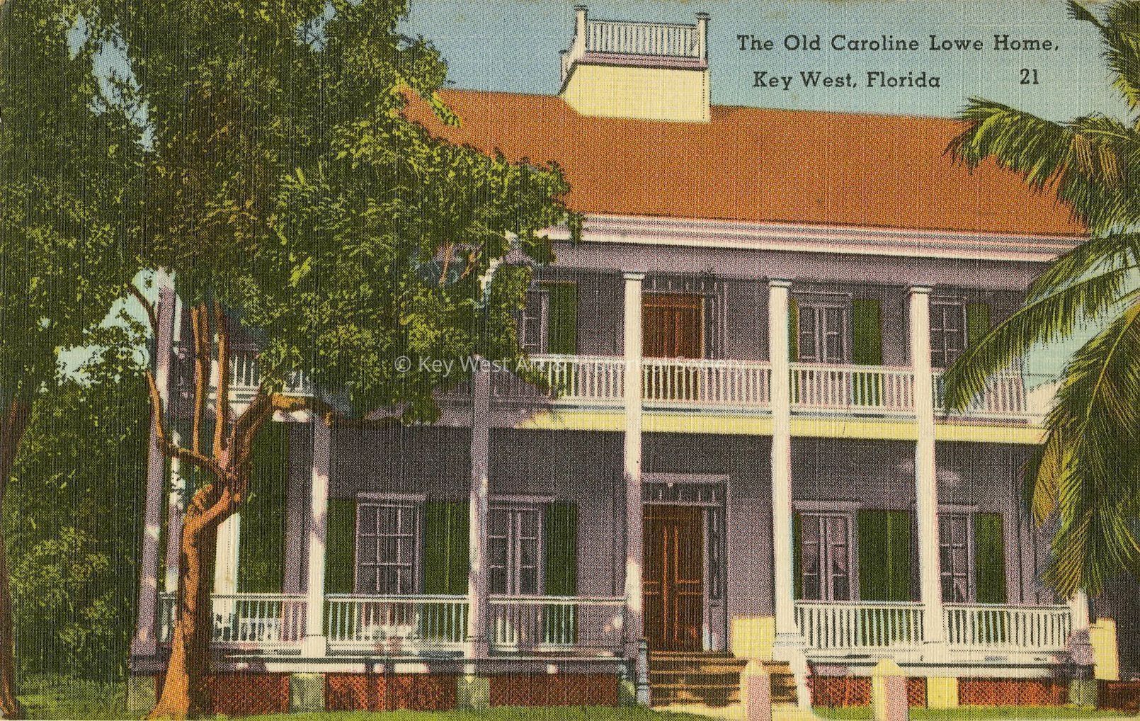 Postcard depicting the Old Caroline Lowe Home in Key West, Florida. Notation on verso, 'No home in Key West is more highly valued both as an example of our distinctive architecture and because of the vivid personality of its former owner than the Caroline Lowe home at the corner of Duval and Caroline Streets. During the unbroken possession of Key West by Federal troops during the war between the States, a be-deviled Provost Marshal never could locate the Confederate Flag that Mrs. Caroline Lowe flung to the breeze from the top of this house whenever she deemed the time auspicious.'Collection