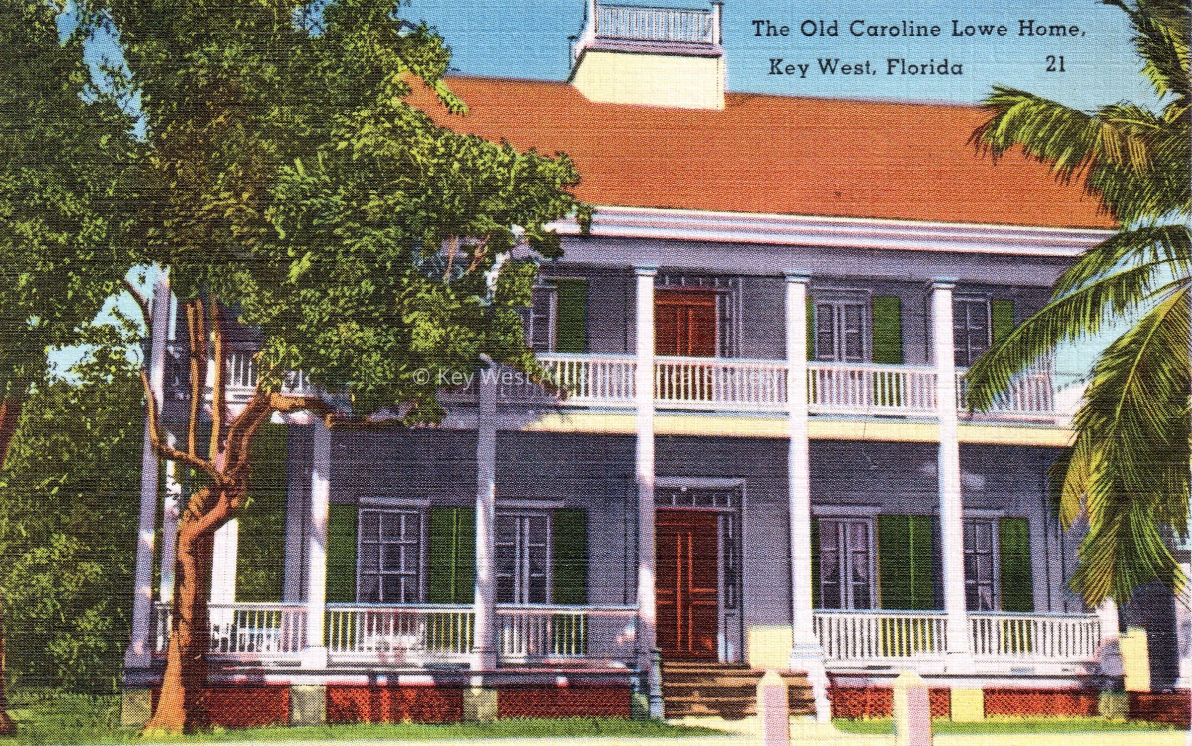 Postcard depicting the Caroline Lowe house at 303 Duval Street. The caption reads, ‘The Old Caroline Lowe Home, Key West, Florida’. The description on the verso reads, 'No home in Key West is more highly valued both as an example of our distinctive architecture and because of the vivid personality of its former owner than the Caroline Lowe home at the corner of Duval and Caroline Streets. During the unbroken possession of Key West by Federal troops during the War between the States, a be-deviled Provost Marshal never could locate the Confederate flag that Mrs. Caroline Lowe flung to the breeze from the top of this house whenever she deemed the time auspicious.'Subject Place