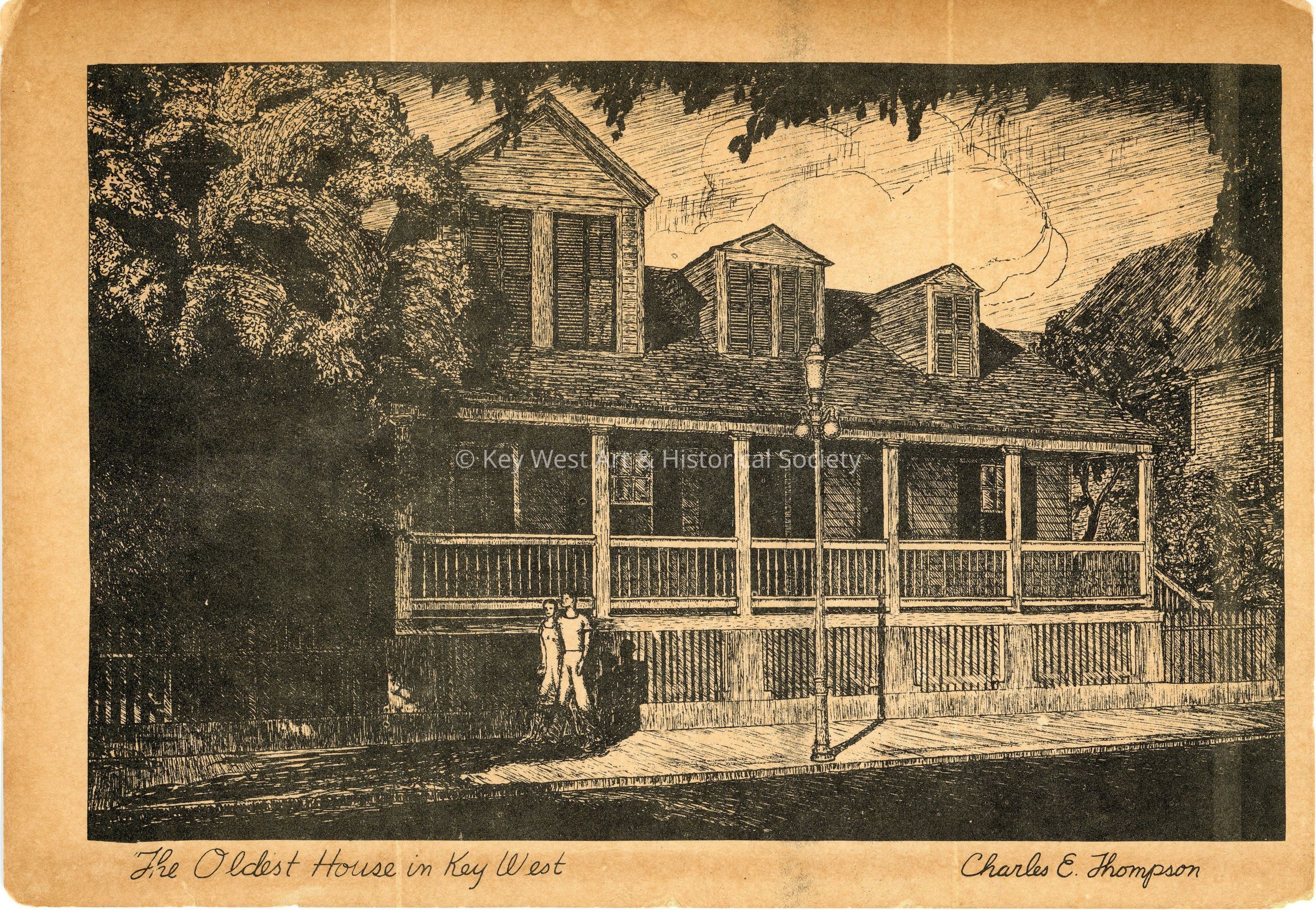 A postcard with a print of a pencil drawing titled 'The Oldest House in Key West' by Charles E. Thompson. The drawing shows a house with three (3) dormers scaling down in size as the viewer looks right and a large covered porch. Two (2) people are walking in front of the house.Subject Place