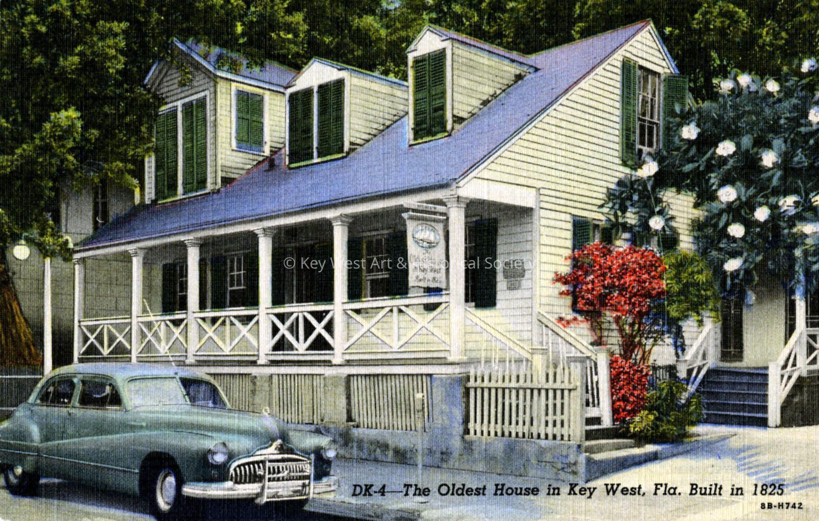 Postcard depicting the Oldest House in Key West at 322 Duval Street. Caption reads, 'The Oldest House in Key West, Fla. Built in 1825.'Subject Place