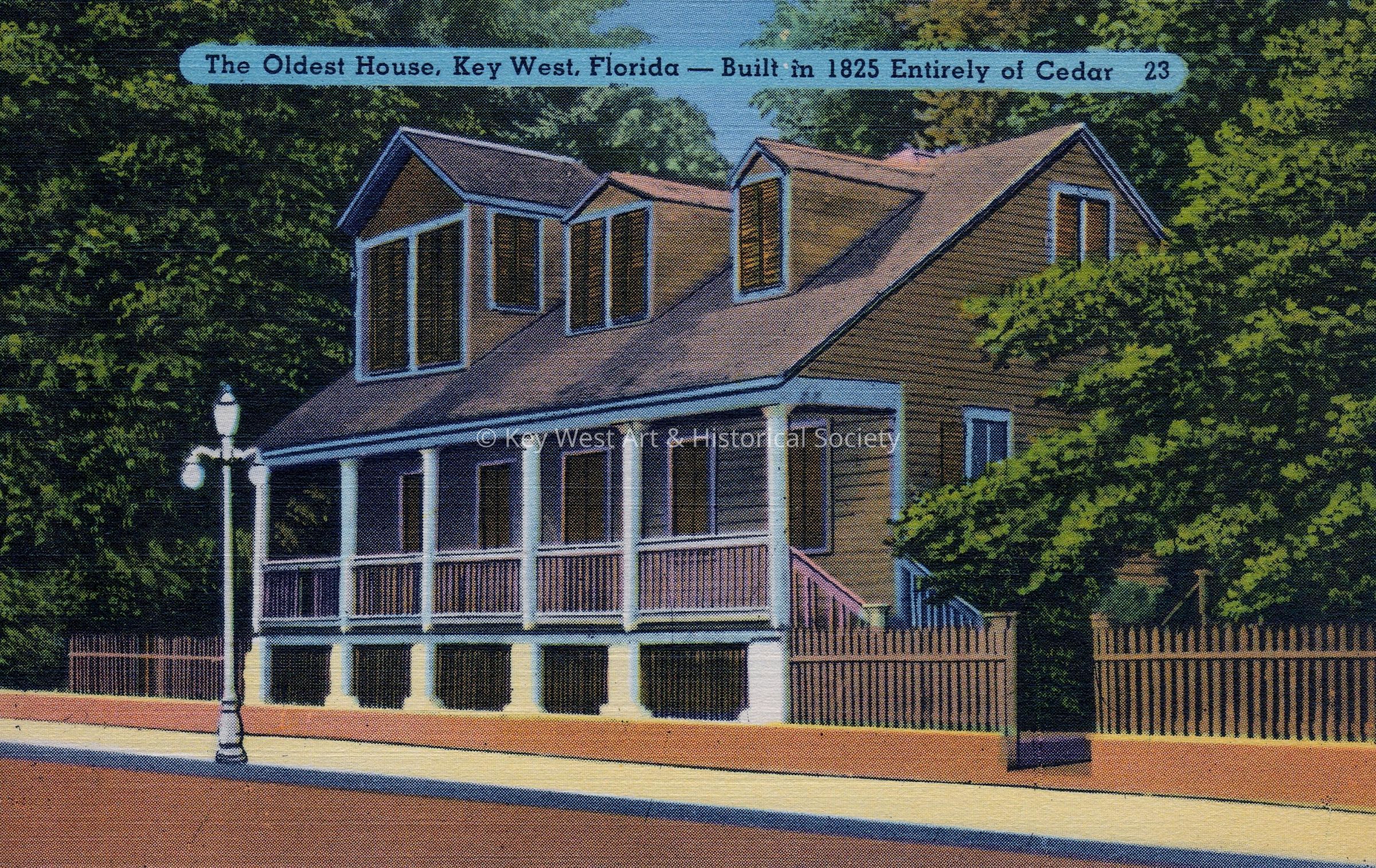 Postcard depicting a Duval Street house with dormers and a porch. The caption reads, ‘The Oldest House, Key West, Florida, built in 1825 entirely of cedar’. The description on the verso reads, 'Built by Captain Coussins in 1825 on Whitehead Street, the oldest house in Key West was moved to its present location by Captain Watlington in 1832. It escaped the "Great Fire" in 1896 that wiped out all its contemporaries.'Collection