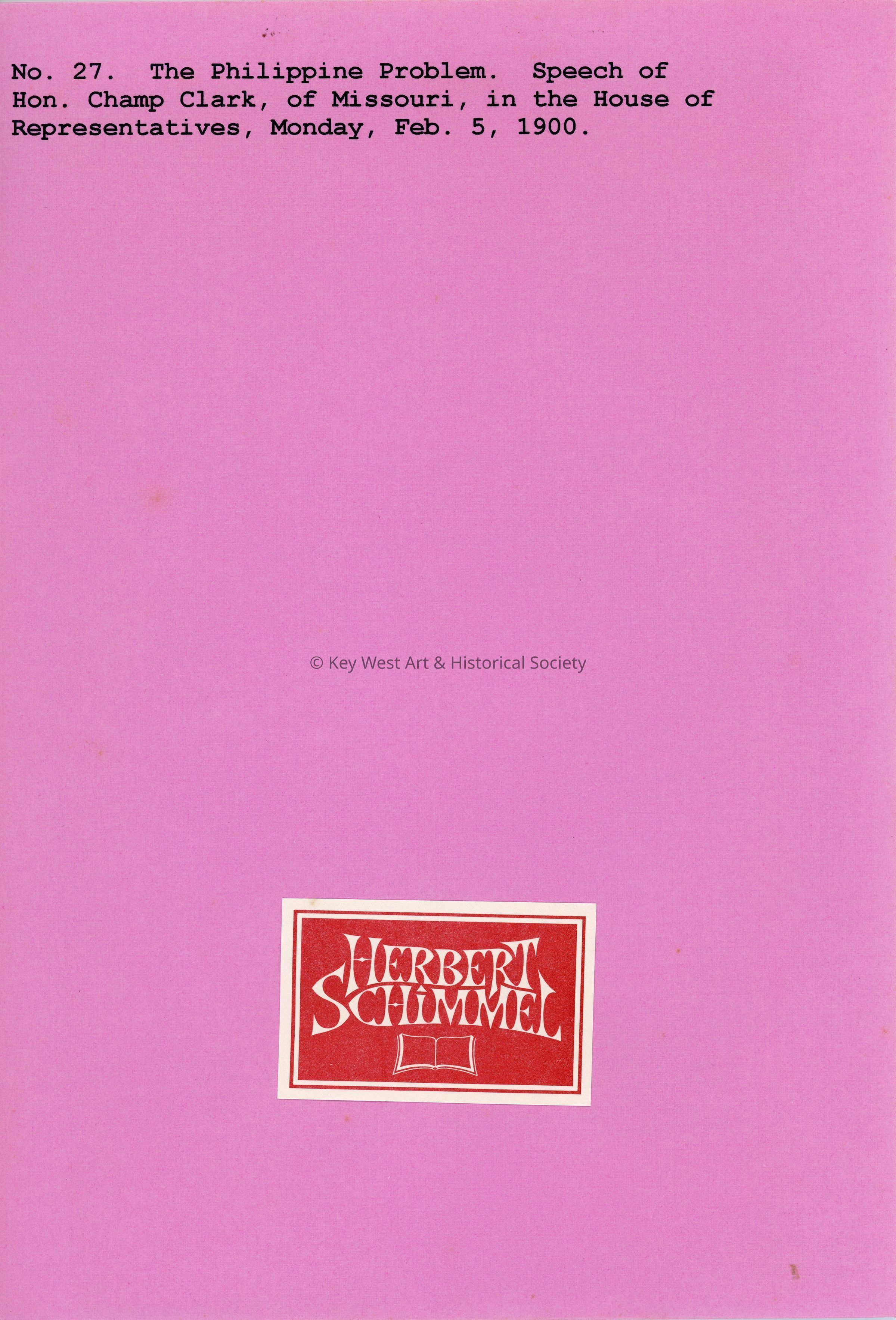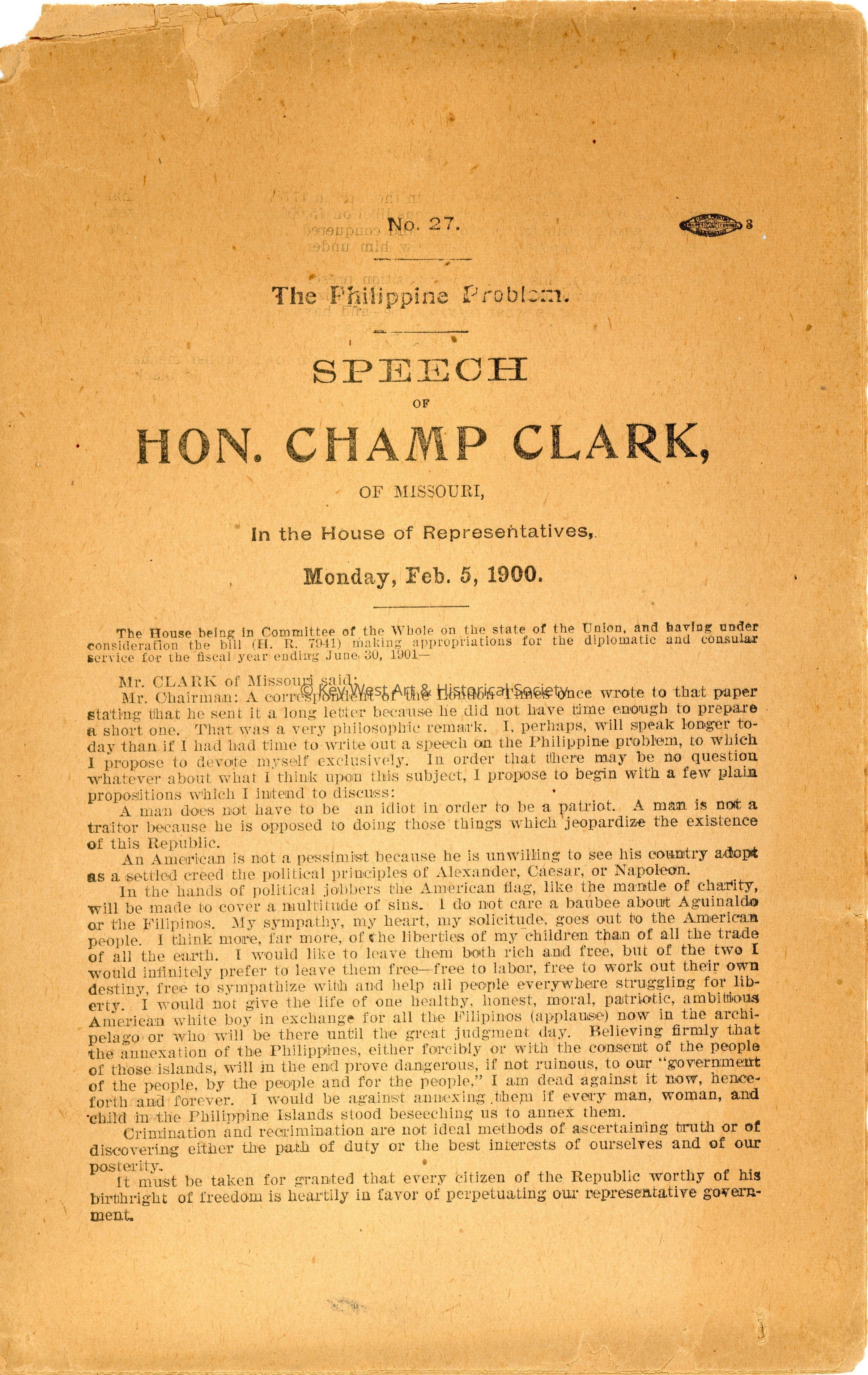 Pamphlet documenting the speech made by James Beauchamp Clark, a Representative from Missouri, on why the Philippines should not be annexed as it would lead to hardship for the United States.Collection