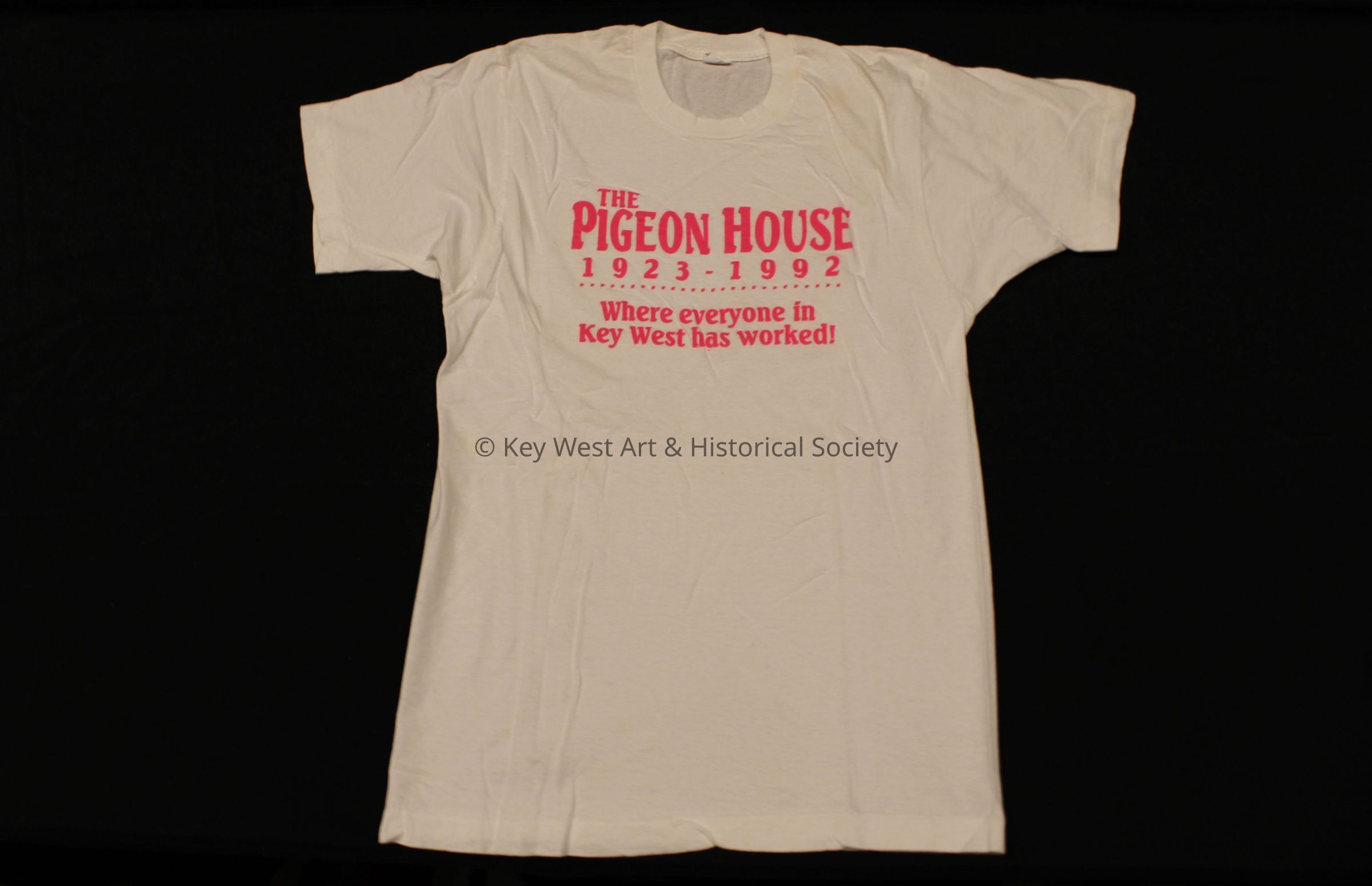 Cotton short sleeved shirt with "The Pigeon House 1923 - 1992 / Where everyone in Key West has worked!" in bright pink lettering. The Pigeon House Patio Restaurant and Bar was once located at 301 Whitehead StreetCollection