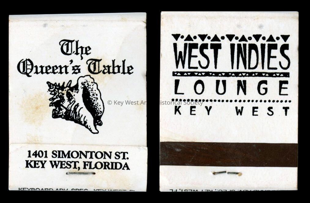 Matchbook from The Queen's Table and the West Indies Lounge formerly located at 1401 Simonton Street.Collection