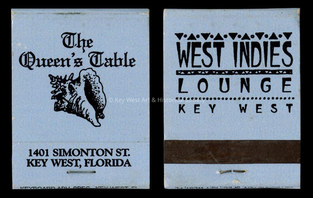 Matchbook from The Queen's Table and the West Indies Lounge formerly located at 1401 Simonton Street.Collection