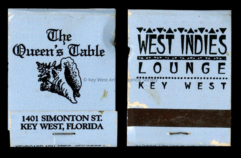 Matchbook from The Queen's Table and the West Indies Lounge formerly located at 1401 Simonton Street.Collection