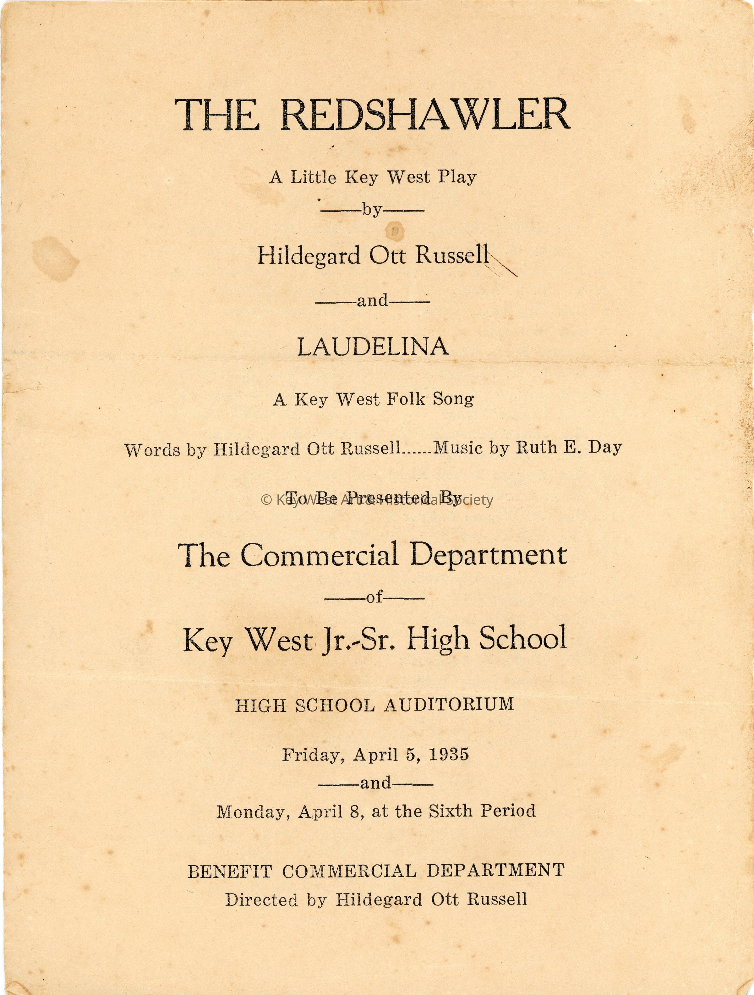 Paper with black text describing 'The Redshawler,' a play put on by the Commercial Department of Key West Junior-Senior High School on the 5th and 8th of April 1935. The play was written by Hildegard Ott Russell and Laudelina and also includes a 'Key West Folk Song,' words by Russell with music by Ruth E. Day.Collection