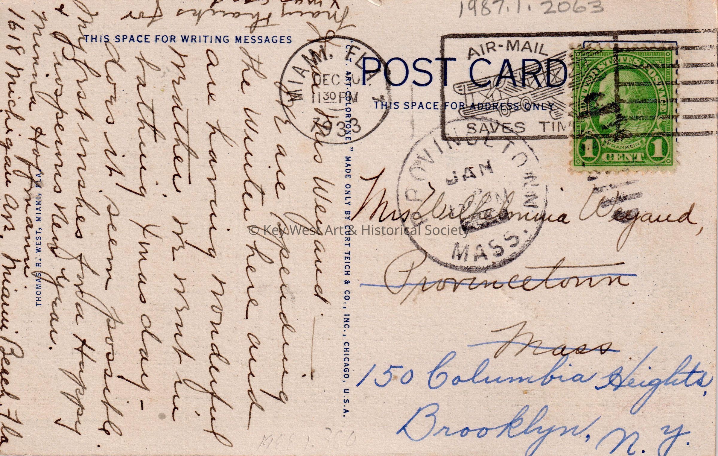 Postcard depicting a large hotel. The caption reads, ‘The Roney Plaza Hotel, Miami Beach, Florida.’ The message on the verso reads, ‘Mrs. Weyaud, We are spending the winter here and are having wonderful weather. We went in bathing Christmas day – does it seem possible. My best wishes for a Happy & Prosperous New Year. Minna Hoffmann, 1618 Michigan Avenue, Miami Beach, Florida. Many thanks for Christmas card.’ The card is addressed to Mrs. Wilhelmina Weyaud, Provincetown, Massachusetts, and 150 Columbia Heights, Brooklyn, New York, and is postmarked Miami, December 30, 1933 and also Provincetown, Massachusetts, January.Collection