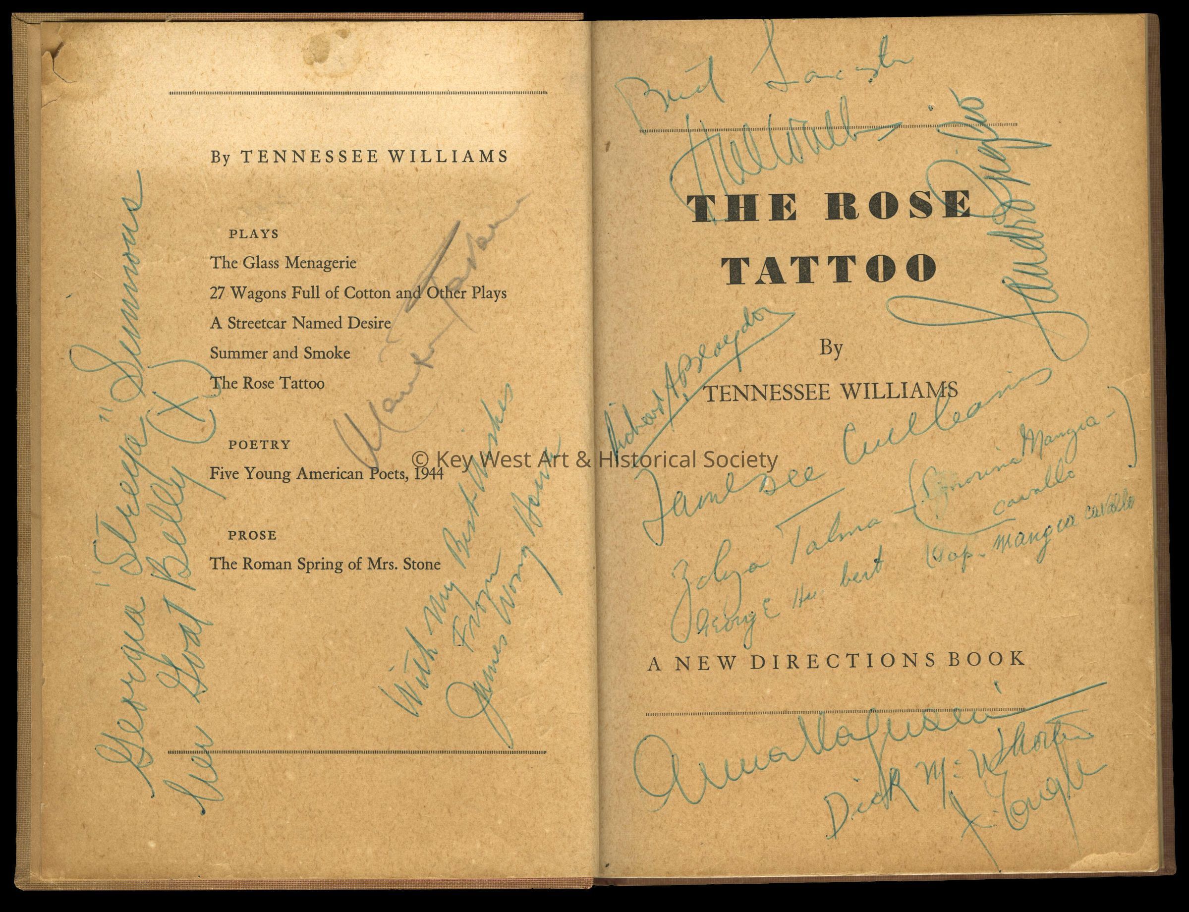 A 143-page first edition of Tennessee Williams' book 'The Rose Tattoo'. Autographed on the title by the author and several cast members from the movie version including Burt Lancaster.Collection