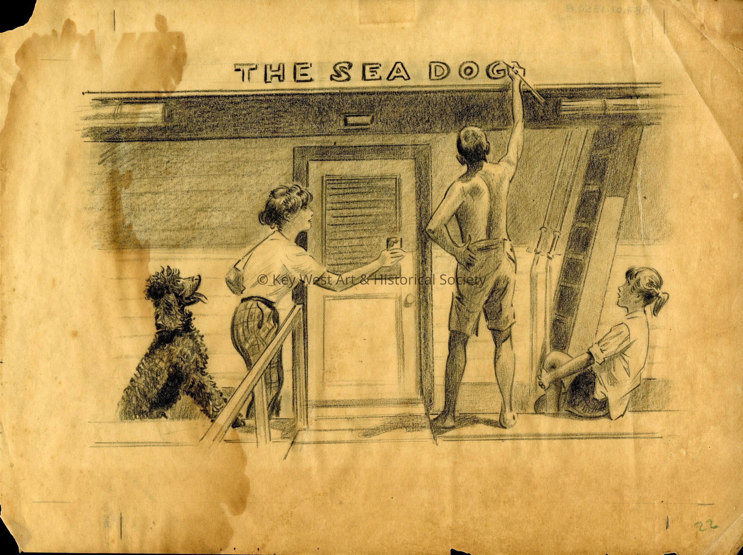 A pencil sketch on brown paper created by Morgan Dennis for his 'Sea Dog' book. The sketch depicts a family and its dog on the stern of a houseboat painting the name of the boat 'The Sea Dog'. This sketch appears on page 22 of the printed book.Type of Drawing