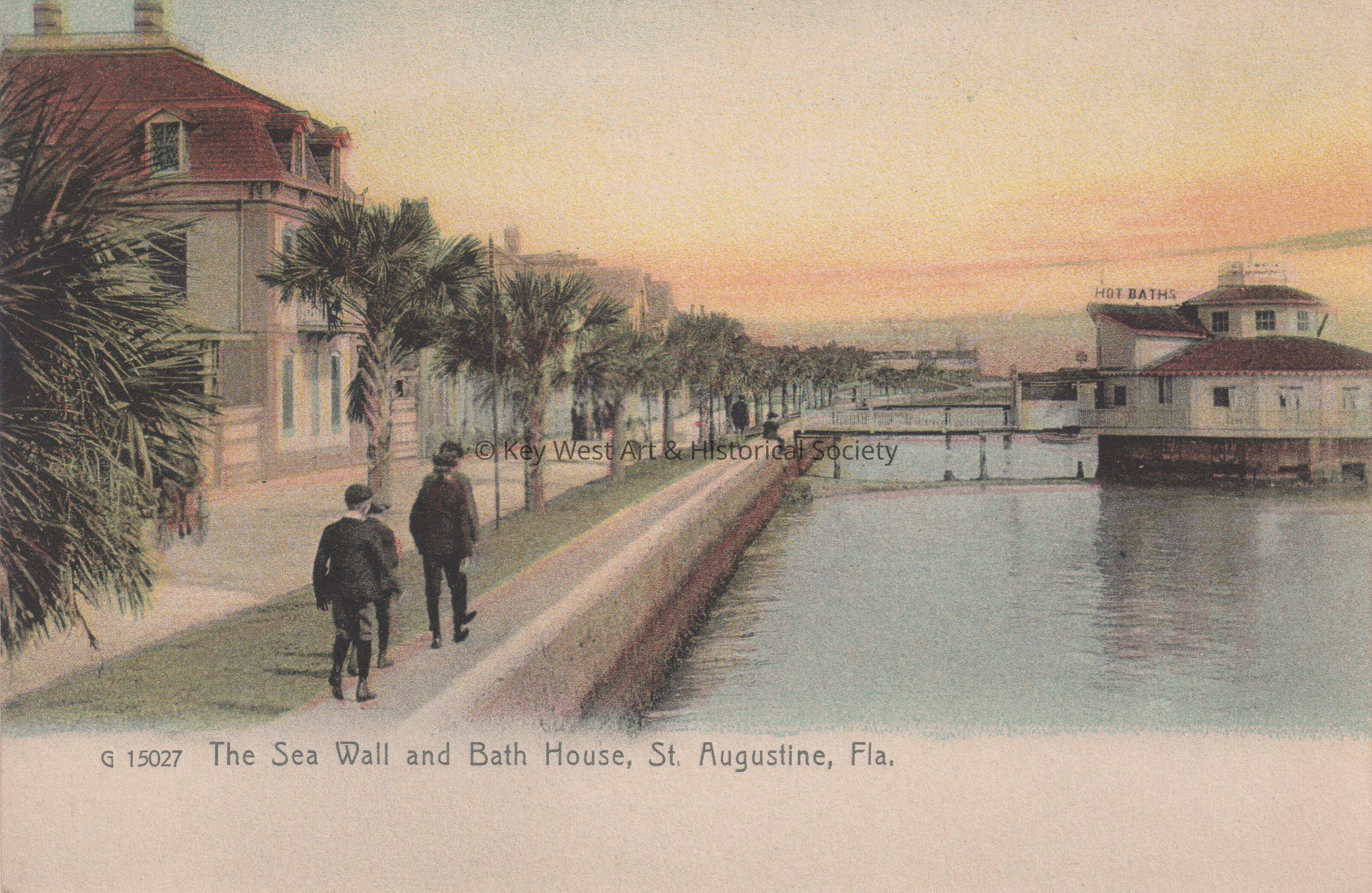 Postcard depicting men and boys on the St. Augustine Sea Wall near the Bath House. The caption reads, ‘The Sea Wall and Bath House, St. Augustine, Florida.’Collection