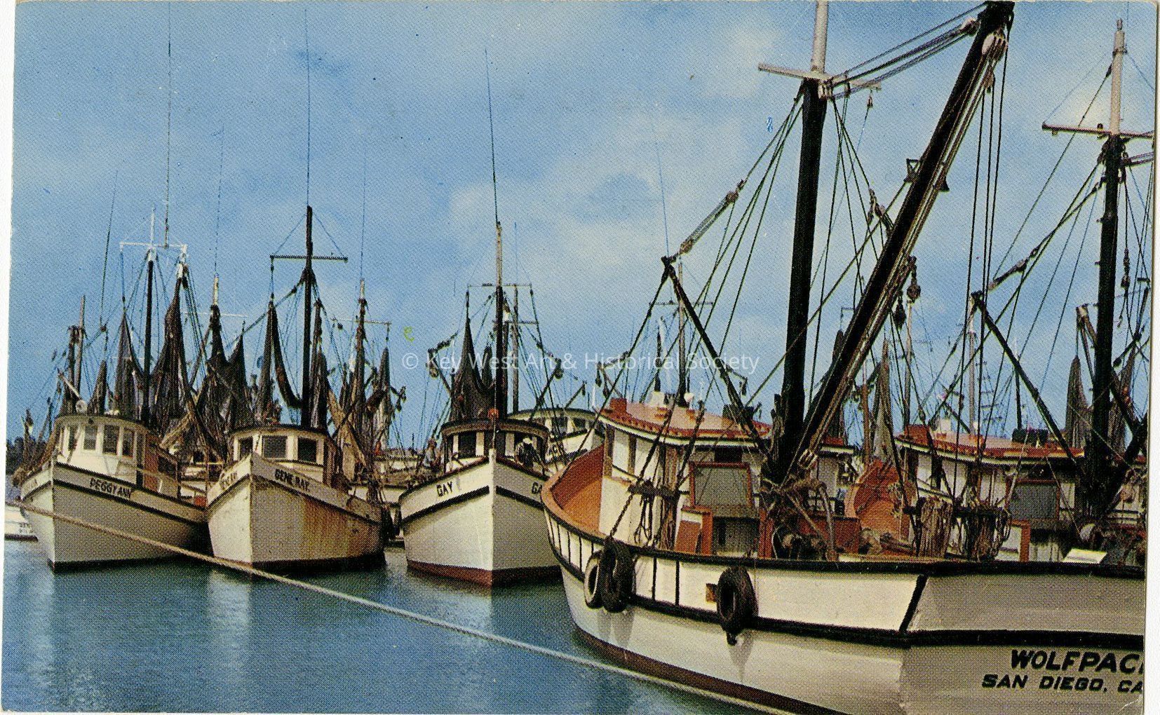 Postcard depicting shrimp boats rafted together at the dock in Key West, Florida.Collection