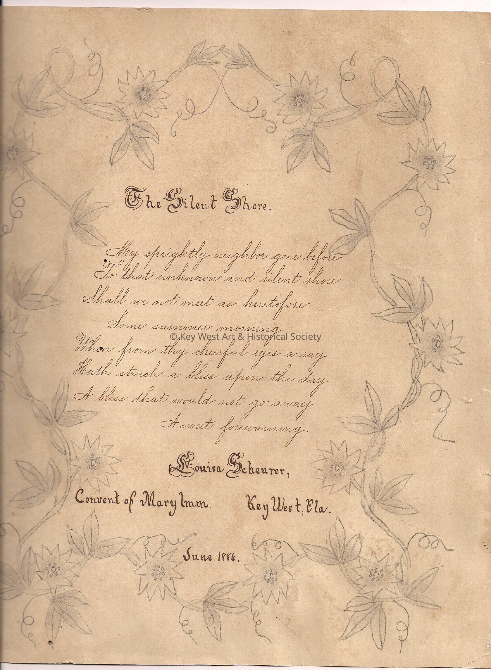 'The Silent Shore,' a poem written by Louisa Scheurer at the Convent of Mary Immaculate in Key West in June 1886. Hand written on heavy manila paper.Collection