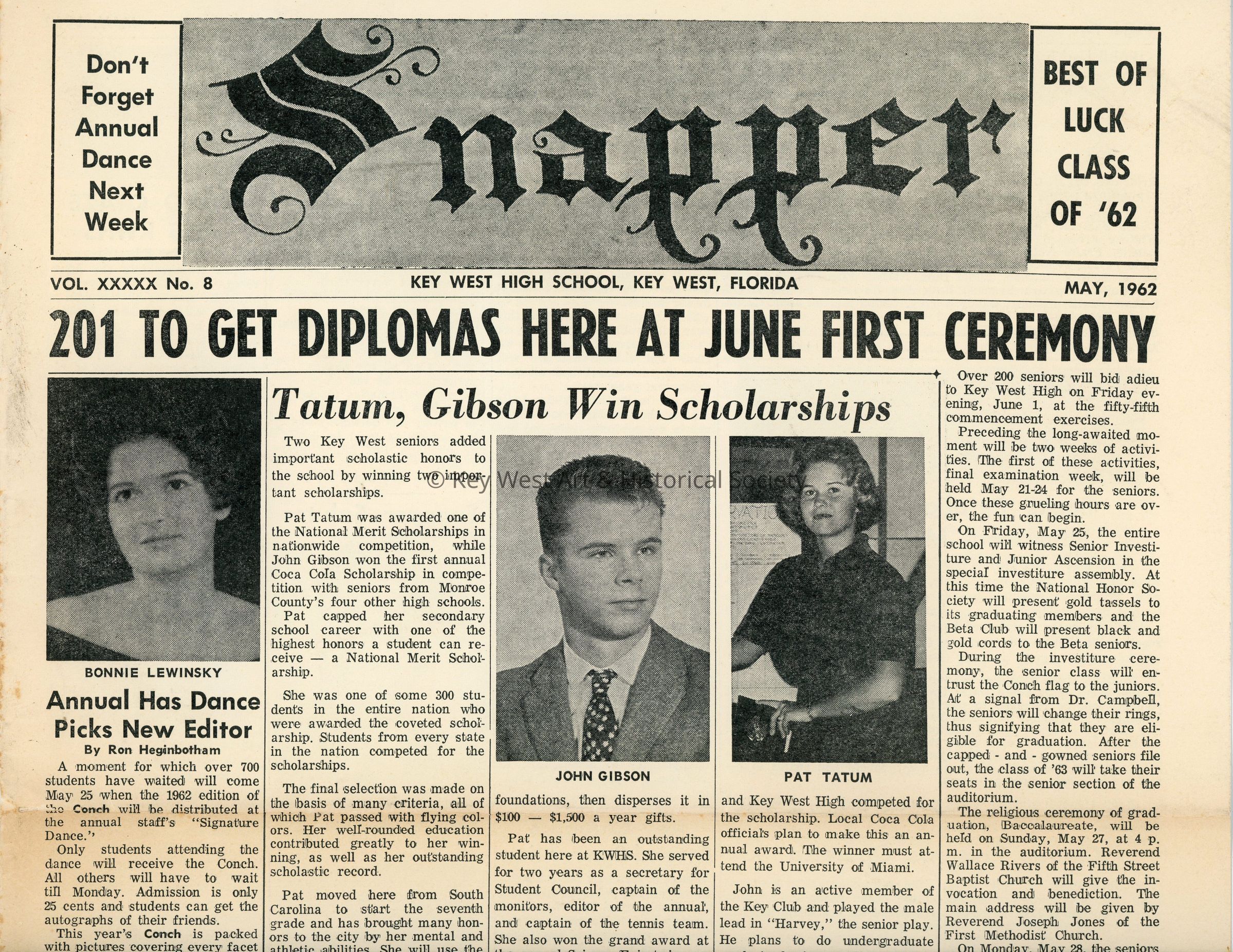 May 1962 edition of Key West High School's student newspaper Snapper containing six pages.