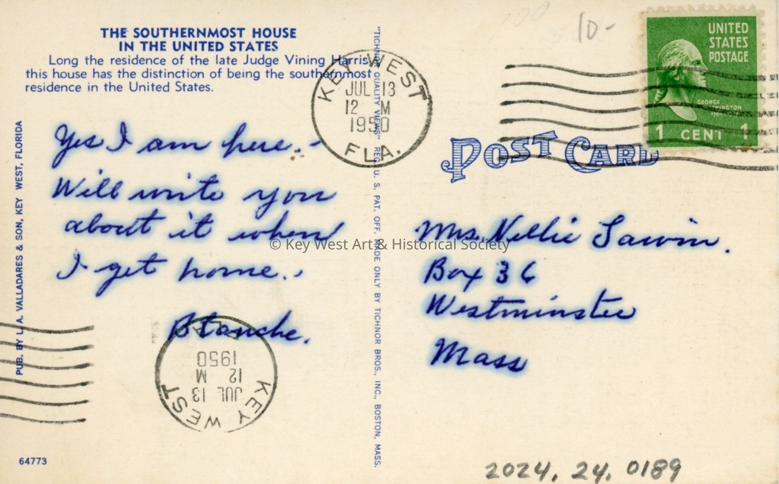 Postcard depicting the Southernmost House in the United States, Key West, Florida.Collection