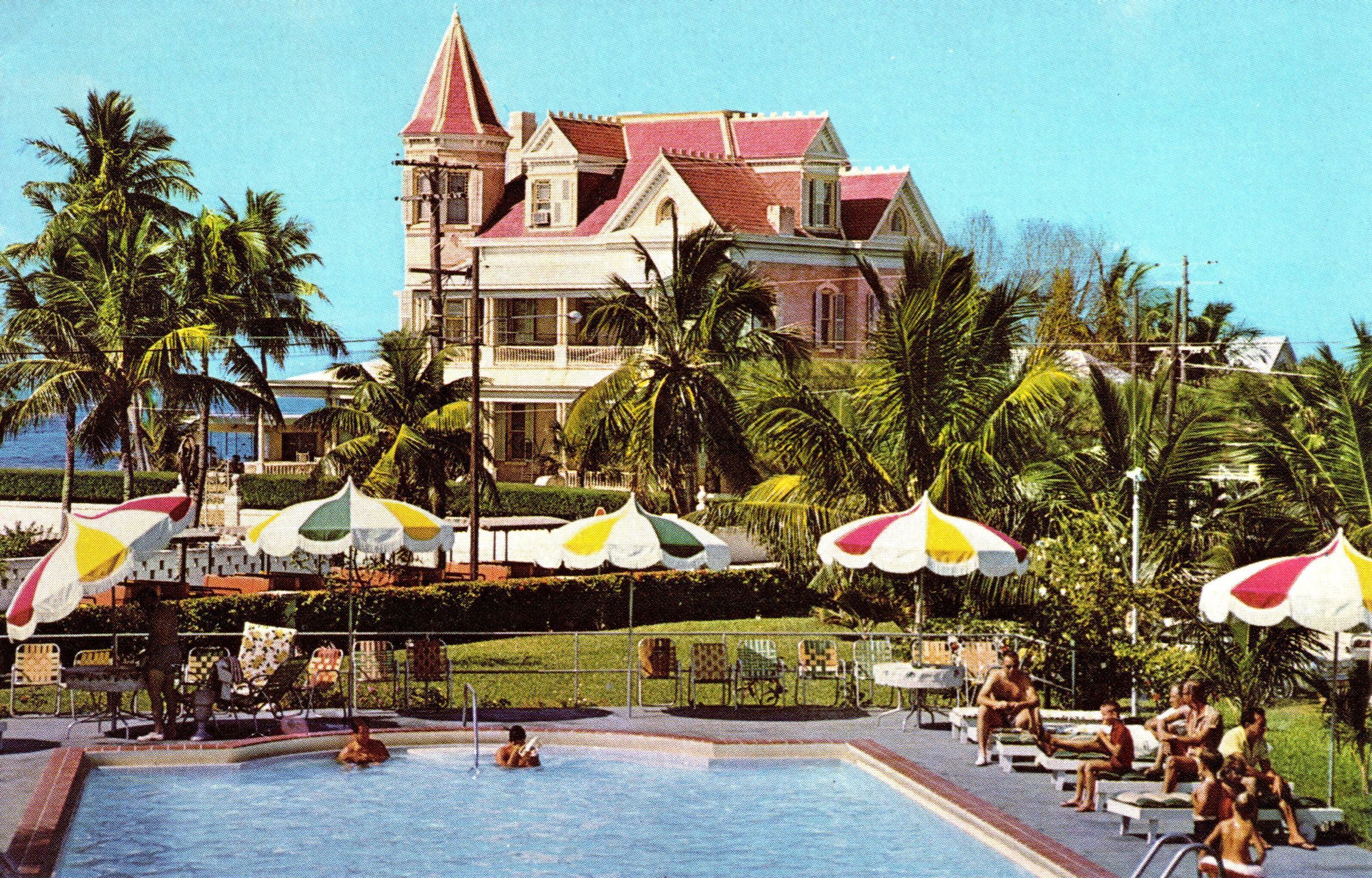 Postcard depicting people in and around a pool with a house and the ocean in the background. The description on the verso reads, 'On the Southernmost land in the United States at Key West. Situated on the Southernmost point of land in the United States is this beautiful castle like structure owned by the late Judge and Mrs. J. Vining Harris and recently restored by Mr. and Mrs. Hilario Ramos.'Subject Place