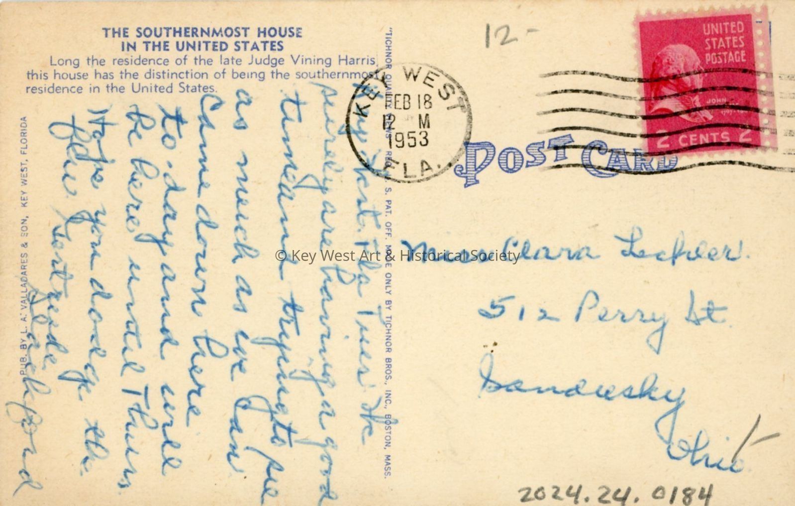Postcard depicting the Southernmost House in the United States, Key West, Florida. "Long the residence of the late Judge Vining Harris, this house has the distinction of being the southernmost residence in the United States."Collection