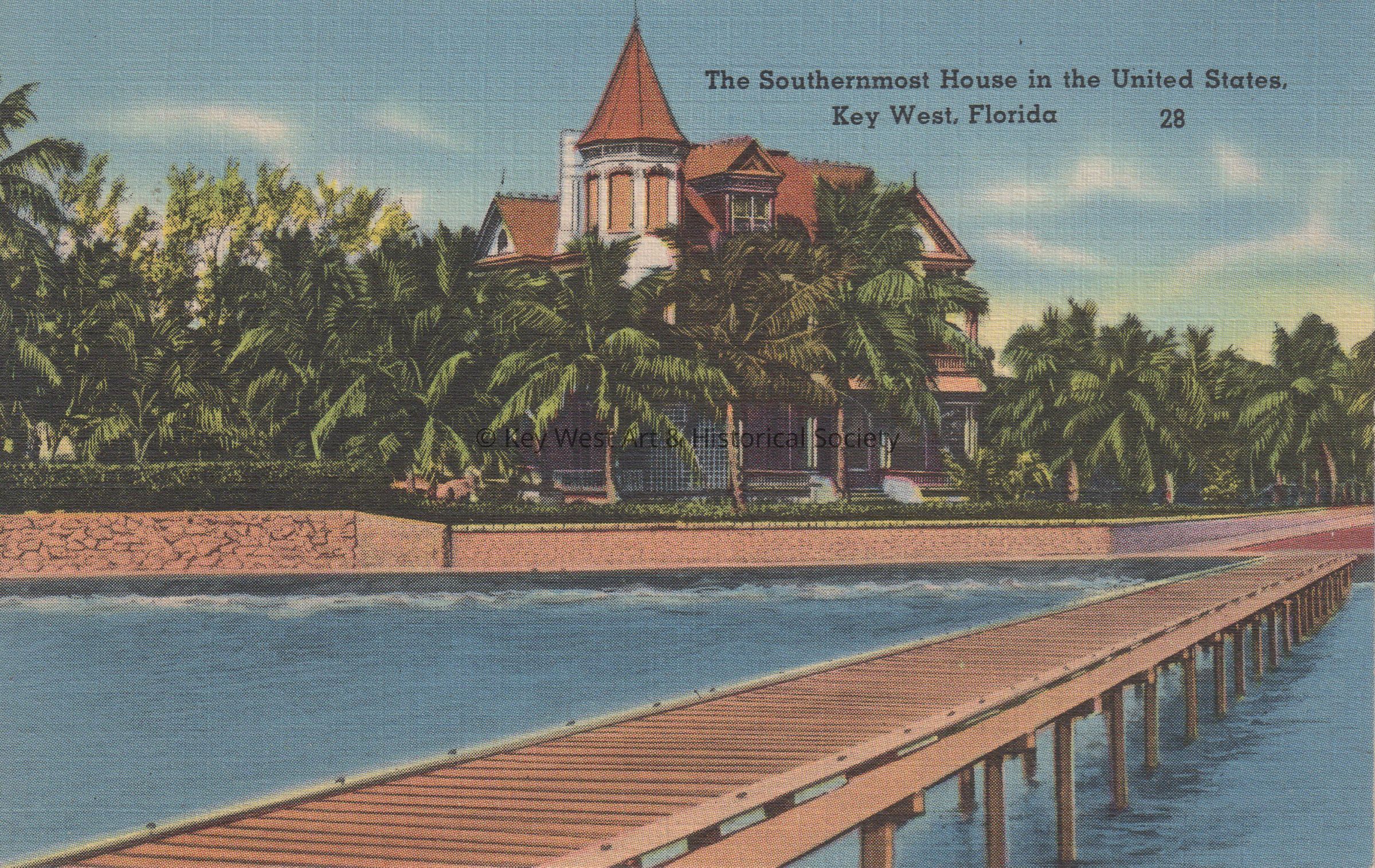 Postcard of a the Southernmost House and the pier extending into the Atlantic Ocean. The caption reads, ‘The Southernmost House in the United States, Key West, Florida’. The description on the verso reads, ‘Long the residence of the late Judge Vining Harris, this house has the distinction of being the southernmost residence in the United States.’Subject Place