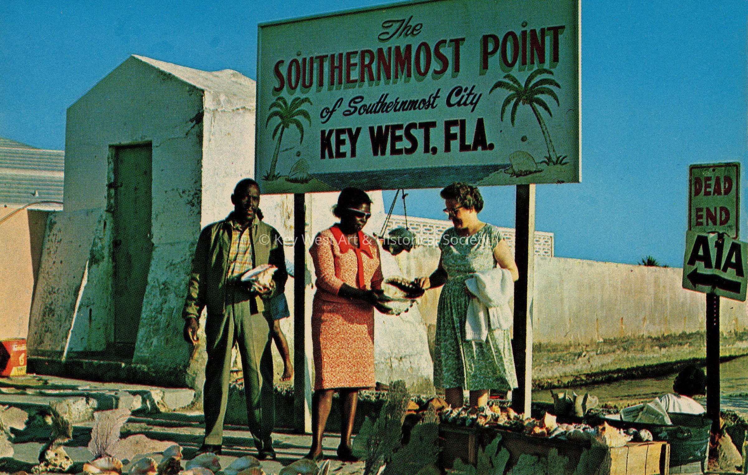 Postcard depicting people with conch shells near a sign that reads, ‘The southernmost point of southernmost city, Key West, Florida’. The description on the verso reads, 'The Southernmost Point in continental U.S.A. is in Key West, Florida. The natives here display giant conch shells for sale.'Subject Place