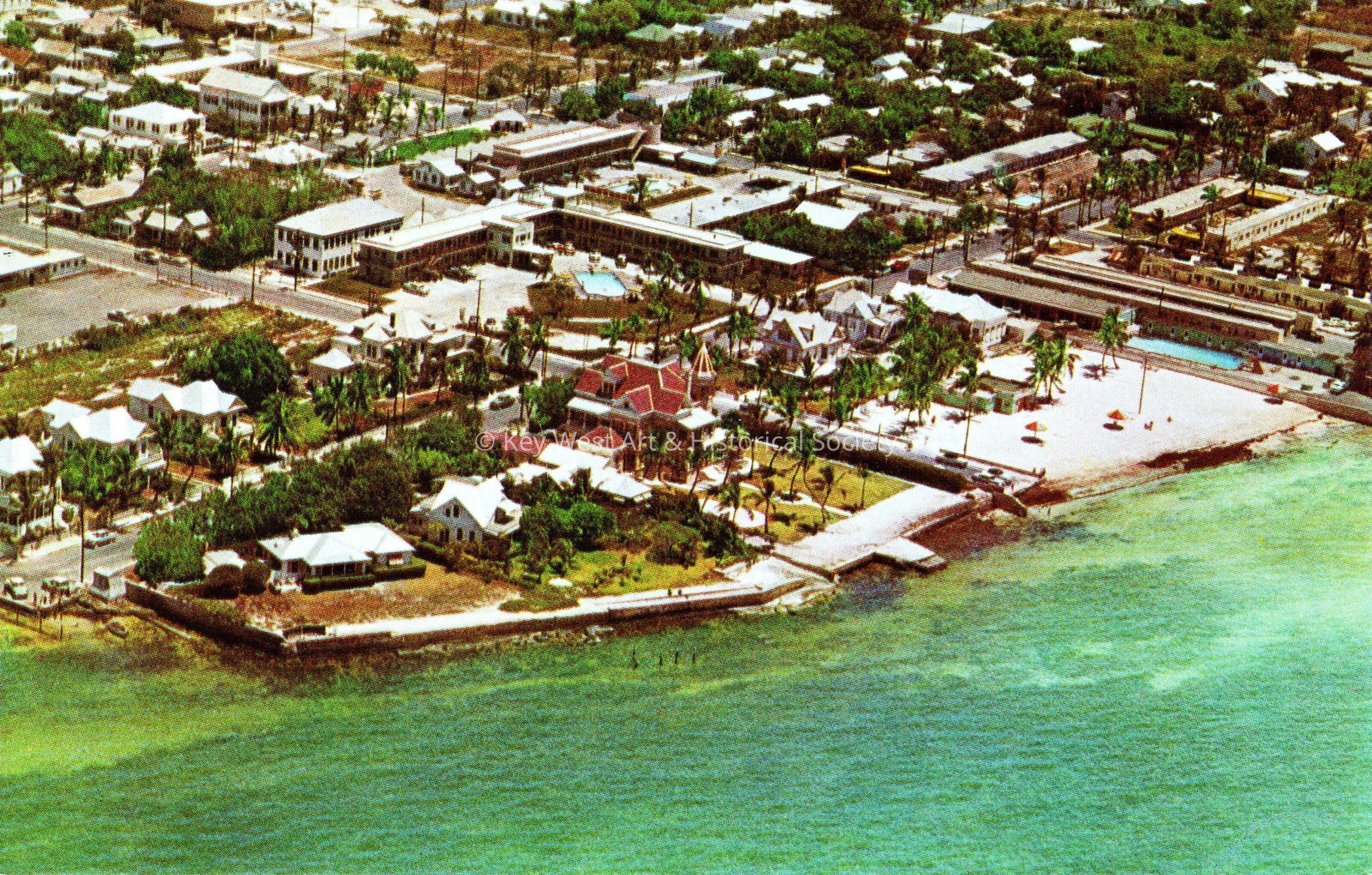 Postcard depicting an aerial view of houses on a beach. The description on the verso reads, ‘The Southernmost point of Land in the United States. South Beach and Resort Hotels in Background. Key West, Florida.’Subject Place