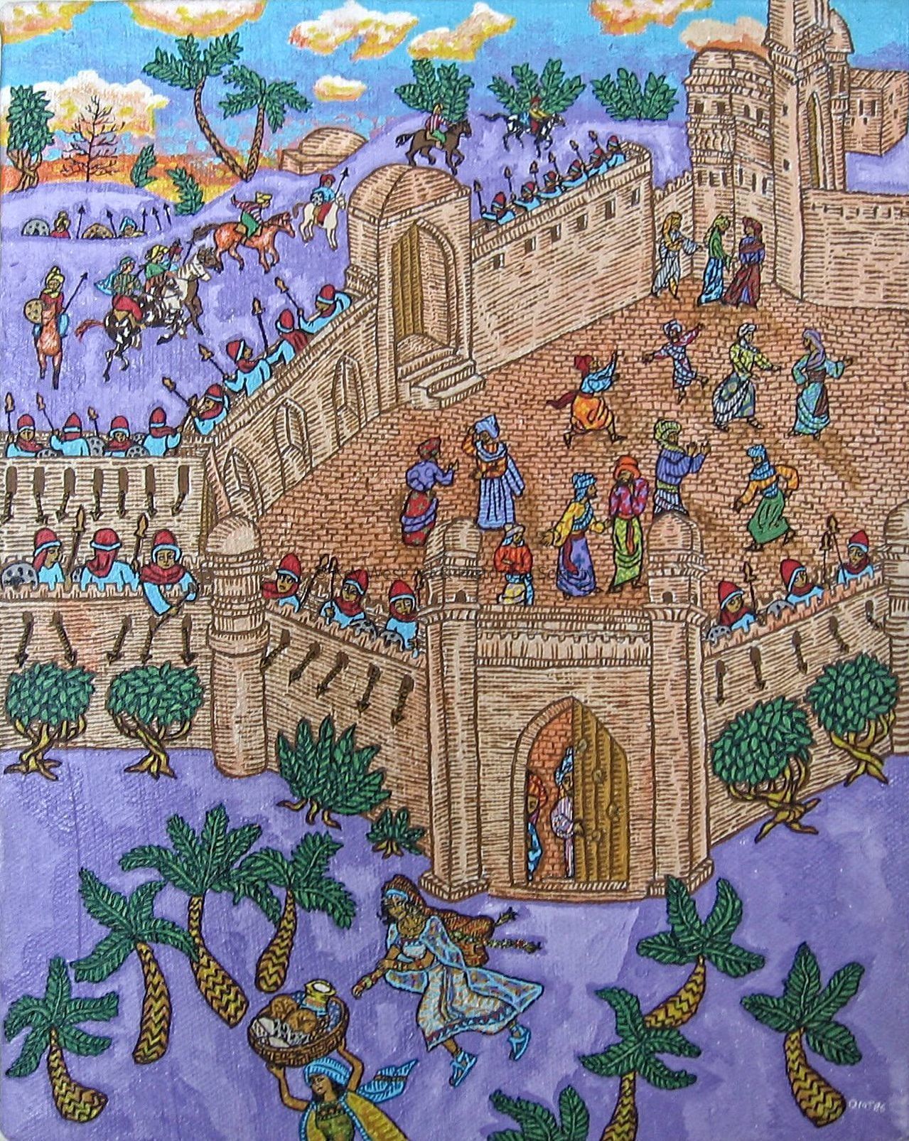Acrylic on canvas depicting a segment of the Book of Judith from the Bible. The scene possibly shows the siege of Bethulia with Judith taking flight from the city outside the walls. One in a series of five paintings. It is a vibrant and bustling scene of a fortified city, depicted in a vivid, detailed style. In the foreground, groups of people dressed in traditional garments are seen walking and interacting near palm trees, suggestive of a market or gathering place. The central part of the painting is dominated by a large stone gatehouse and a wall that extends into the background. Mounted riders approach the city from the left, riding horses across a low hill. Within the walls of the city, figures in various colored clothing appear active and engaged in different activities, contributing to a lively urban atmosphere. The sky is filled with pastel hues, implying either dawn or dusk, adding a serene backdrop to the otherwise dynamic setting. The artwork’s intricate patterns and vivid color palette capture the essence of a bustling ancient or medieval city full of life and activity.Type of Painting