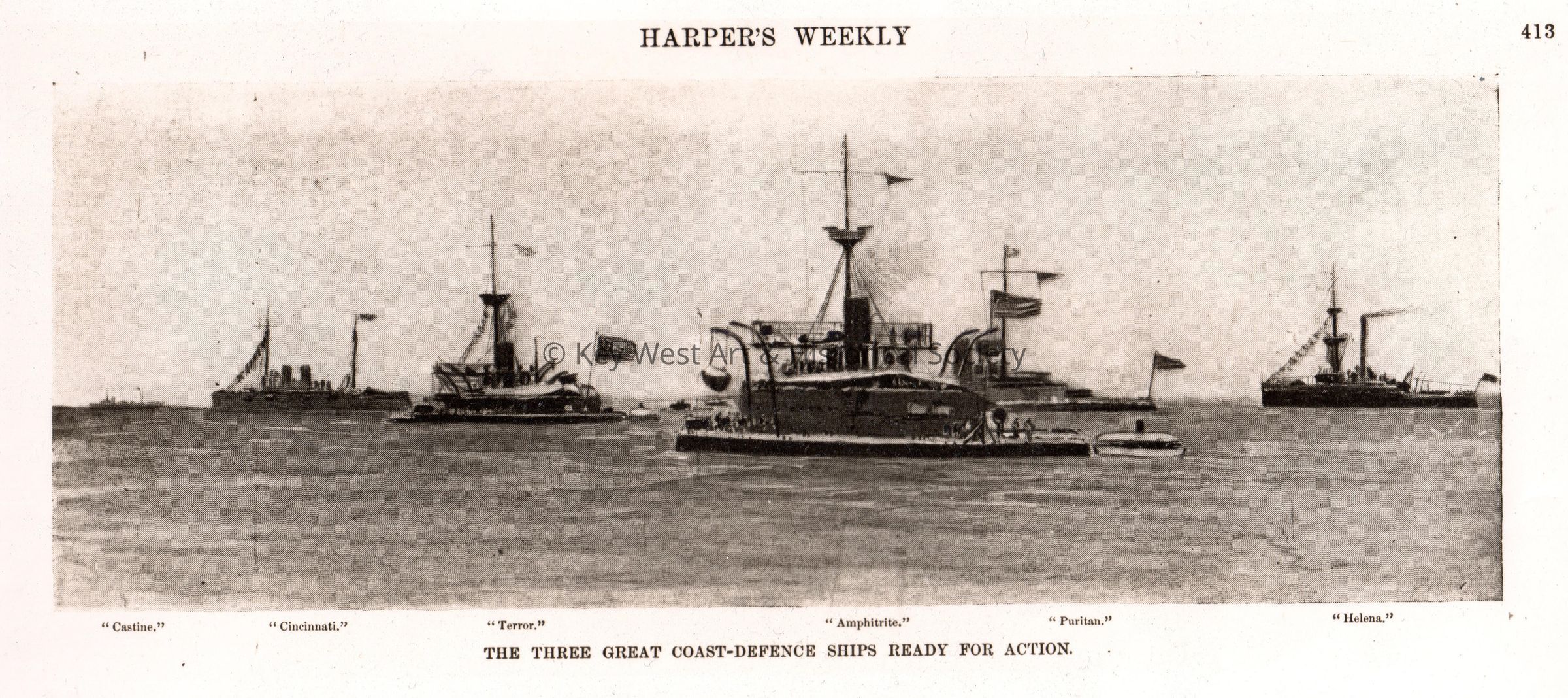 Black and white photograph taken from an issue of Harper's Weekly depicting 'The Three Great Coast-Defence Ships Ready for Action'. U.S. Naval ships are CASTINE, CINCINNATI, TERROR, AMPHITRITE, PURITAN and HELENA.Photograph Details